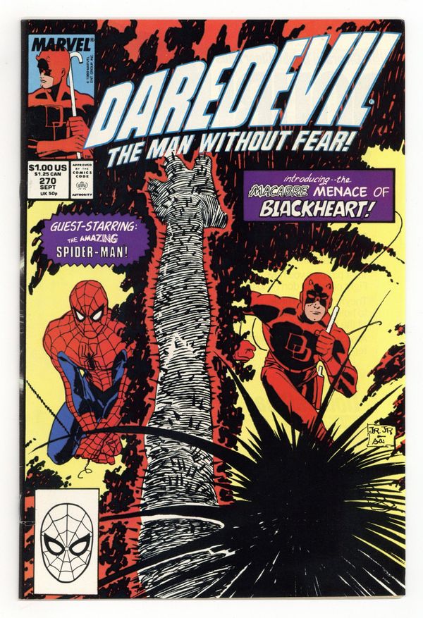 Direct Edition. Cover pencils by John Romita, Jr., inks by Al Williamson. 1st appearance of Blackheart (the son of Mephisto) in Blackheart!, script by Ann Nocenti, pencils by John Romita, Jr., inks by Al Williamson; On a hill of humanity's evil, Blackheart is born and DD and Spider-Man have to fight like the devil to take him down; Mephisto appearance. First $1.00 cover price. 36 pgs. Cover price $1.00. Cover price $1.00.