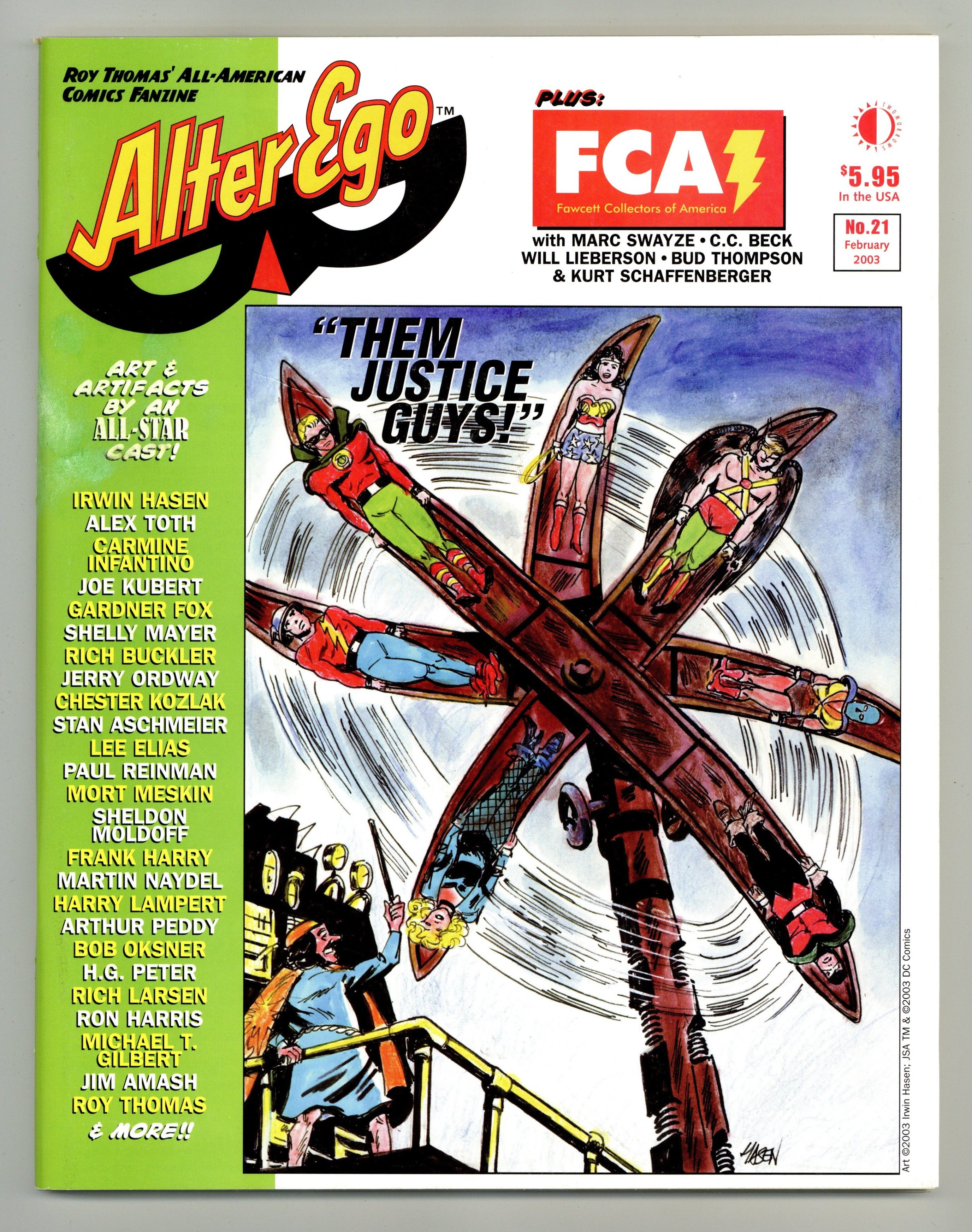Published Feb 2003 by TwoMorrows.$105.00Alter Ego #21 headlines The Iger Comics Kingdom of the 1940s-50s and the Golden Age Justice Society of America, with two fabulous full-color covers ? Dave Stevens (Sheena) and Irwin Hasen (JSA)! Inside, the "shop" that created art and story for Quality, Fiction House, Fox, and many others is examined, with rare art and artifacts by Will Eisner, Lou Fine, Murphy Anderson, Reed Crandall, Matt Baker, Mort Meskin, Nick Cardy, George Evans, Bob Kane, George Tuska, Jack Kamen, and many others! There's a special "Sheena" section with art by Dave Stevens, Frank Brunner, and other fantastic "good girl" artists over the years! Plus, Roy Thomas on the JSA and All-Star Squadron ? featuring scarce art by Gil Kane, Jack Kirby, Alex Toth, Jerry Ordway, Rich Buckler, Mart Nodell, Irwin Hasen, et al. ? including still more unseen art from an unpublished 1946 All-Star Comics adventure! Also, Michael T. Gilbert concludes the Gardner Fox scrapbook, with plenty of rarely-seen art, plus there's FCA (Fawcett Collectors of America) with C.C. Beck, Marc Swayze, Will Lieberson, Kurt Schaffenberger, and others! (TwoMorrows Publishing) Magazine, 108pg, b&w $5.95 Cover price $5.95.