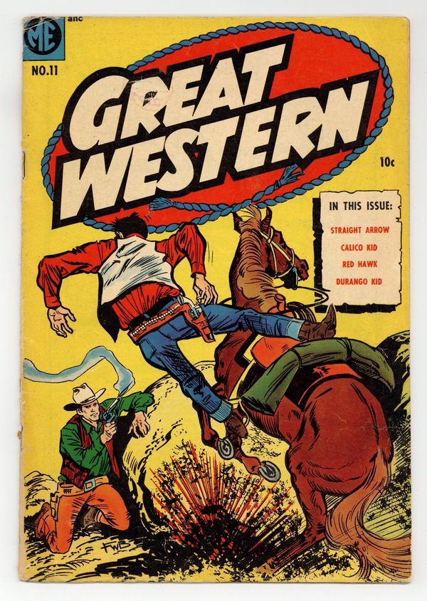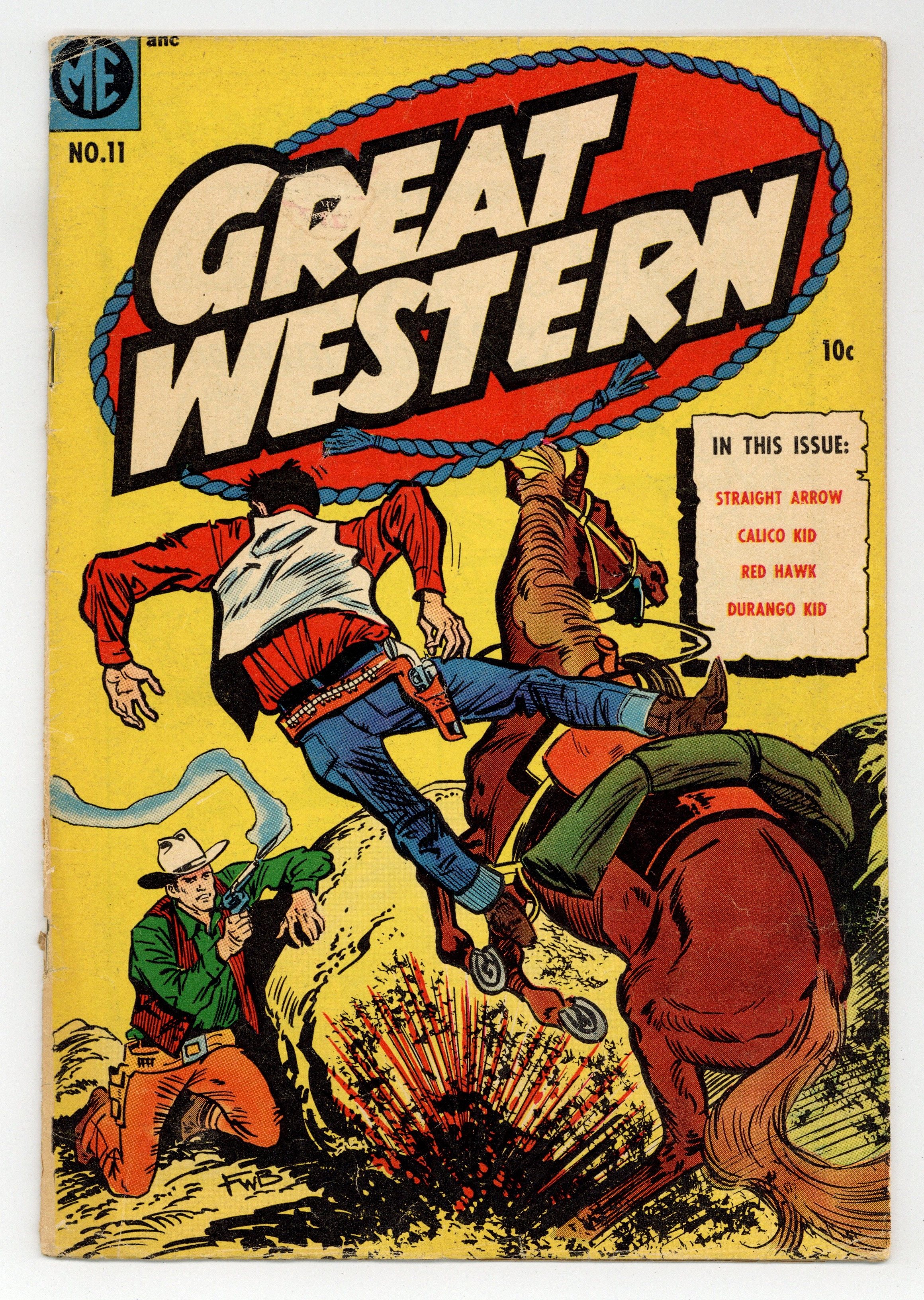 (A-1 Comics #127) Cover by Frank Bolle. Stories by Gardner Fox and others. Art by Dick Ayers , Fred Meagher, Joe Certa and Bob Powell. Sometimes listed as A1 Comics (1944 Life's Romances) #127. Tales of Western adventure from Magazine Enterprises, featuring heroes like Red Hawk and the Durango Kid. To escape his capture by the Blackfeet, Red Hawk must use a legendary unbendable bow; Outlaws believe they have killed Straight Arrow, but his ghost rides after them; Durango Kid seeks the culprits behind the very first Pony Express robbery. Also featuring an ad for a glow-in-the-dark Ghost Rider scarf/mask for kids to wear. Straight Arrow: The Ghosts of Straight Arrow; Red Hawk: The Bow That Would Not Bend; Durango Kid: Peril of the Pony Express; The Calico Kid: Night Fight. 32 pages, Full Color. Cover price $0.10.