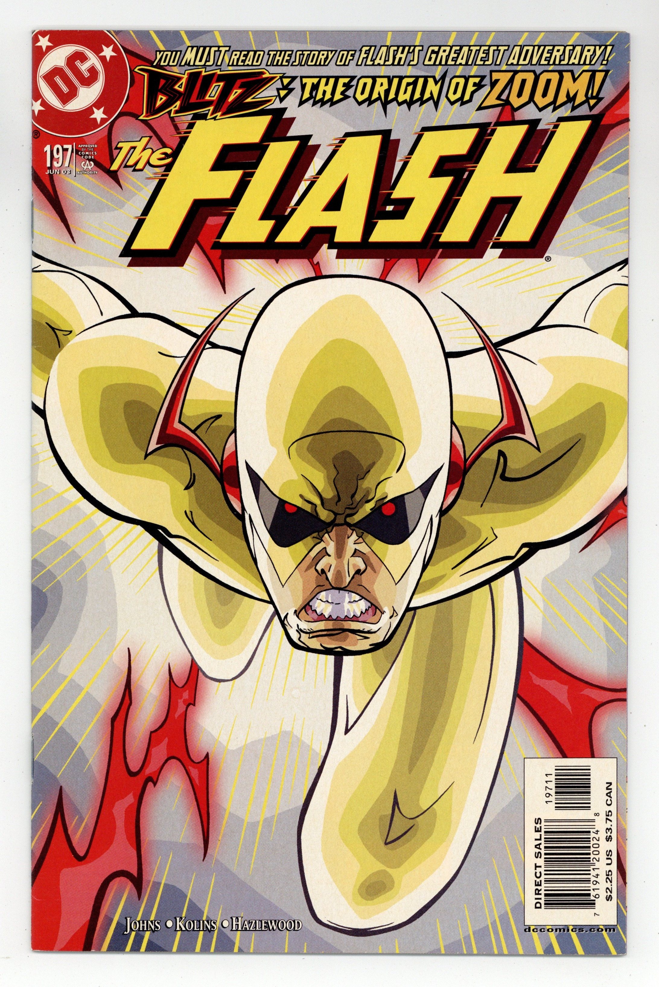 Direct Edition. Written by Geoff Johns; Art by Scott Kolins and Doug Hazelwood. Cover by Scott Kolins. "Blitz," Part 1 of 4, leading up to THE FLASH #200! Professor Zoom returns in a story that reveals the secrets behind his origin! But what's his strange goal? It's not what you'd think! NOTE: The first part of the powerful four-part story "Blitz" has sold out at the publisher (less than a week after its release) and DC has no plans to go back to press on at this time. "I'm really excited that 'Blitz' is starting off so strong, but really the roller coaster has only gone over the first hill we haven't even hit the loops yet," says writer Geoff Johns. "I've said it before and I'll say it again: Issue #200 will change the world of the Flash and Zoom forever. We're just getting out of the gate here, and I'm glad so many are along for the ride." FC, 32 PG.$2.25 Cover price $2.25.