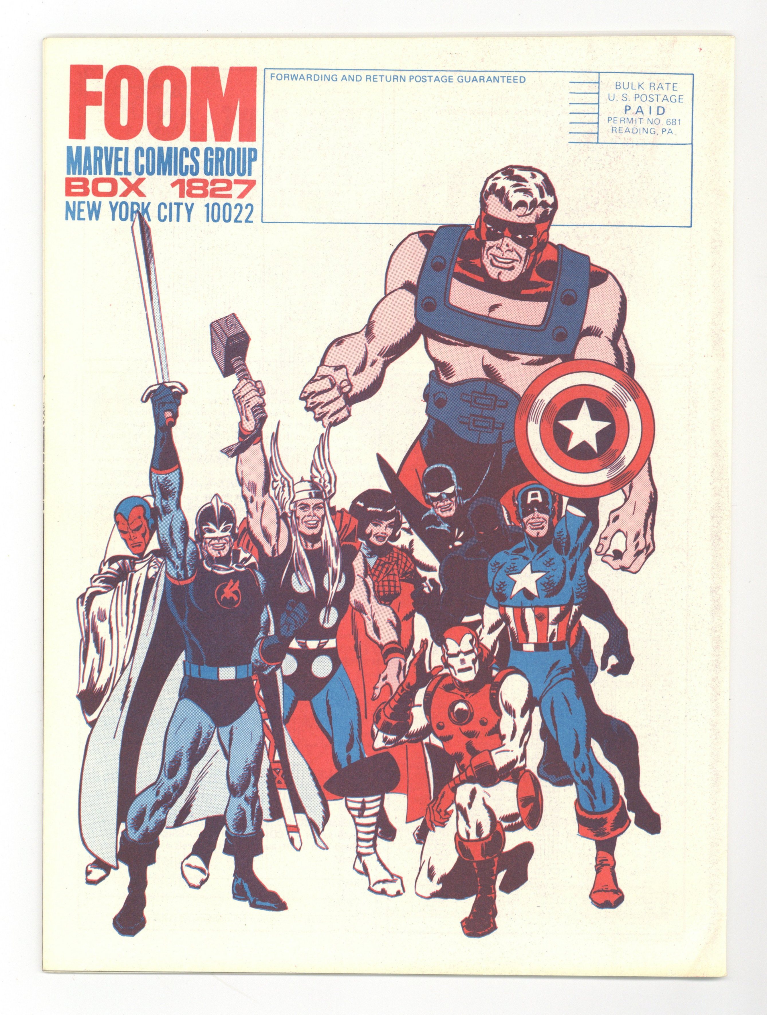 Spider-Man issue. Spider-Man article, puzzles, and checklist (Amazing Spider-Man issues 1-125; Annuals 1-9; Marvel Team-Up 1-13), plus a new Jim Steranko illustration. John Romita pin-up. Short bios of Romita, Gil Kane, and Frank Giacoia. Fan art pages include submissions by Grant Miehm and Tom Lyle. Steranko infinity cover. Sal Buscema Avengers back cover.