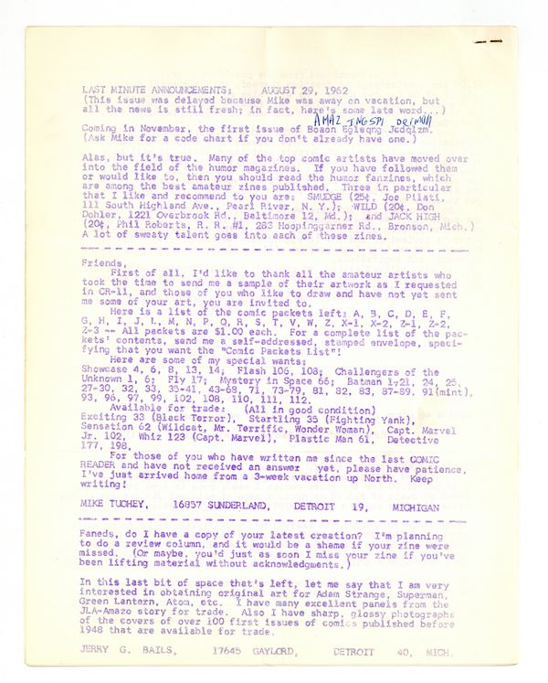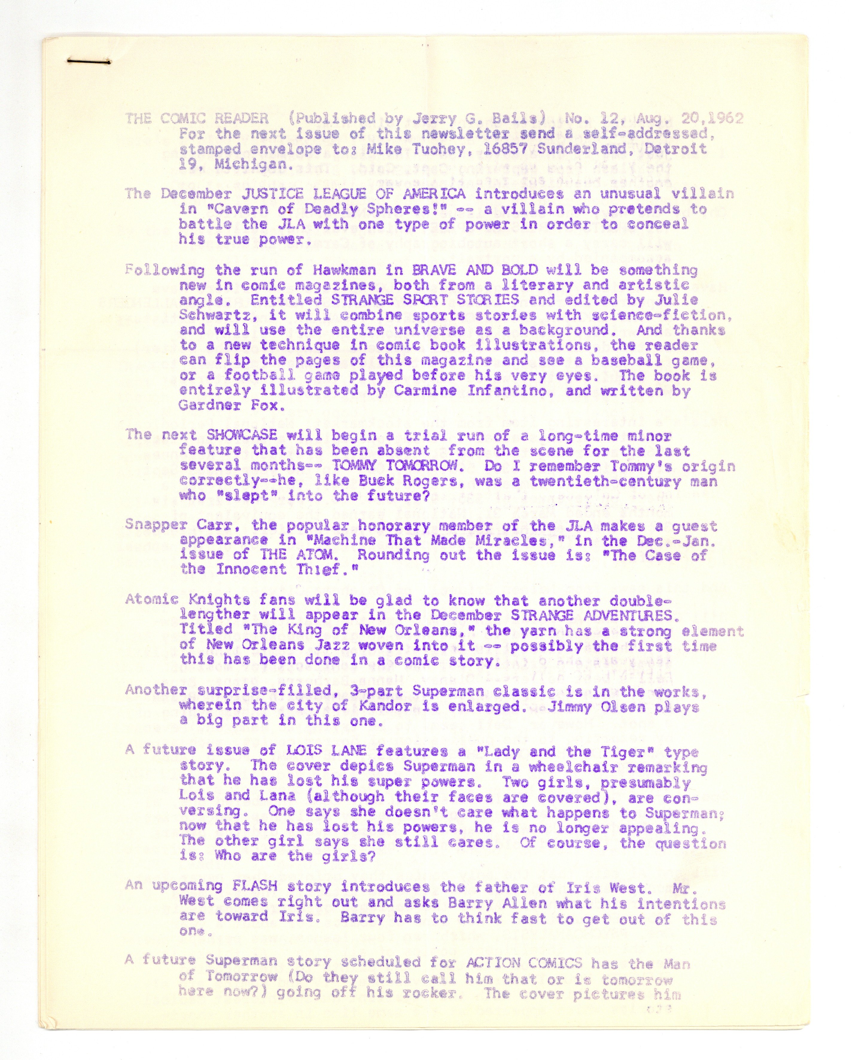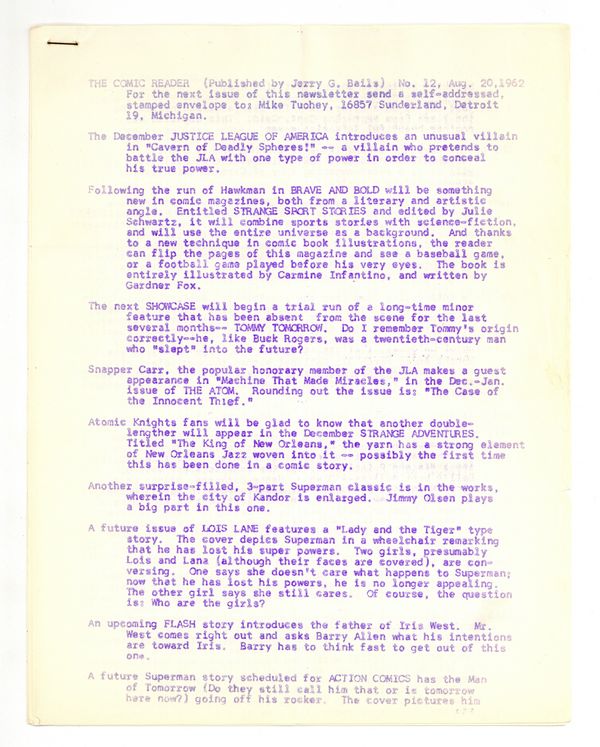 Published by Jerry Bails, the Father of Comic Book Fandom, The Comic Reader was one of the earlier comic book fanzines, making it an important part of comics history. 8.5" x 11", 8 mimeographed pages.