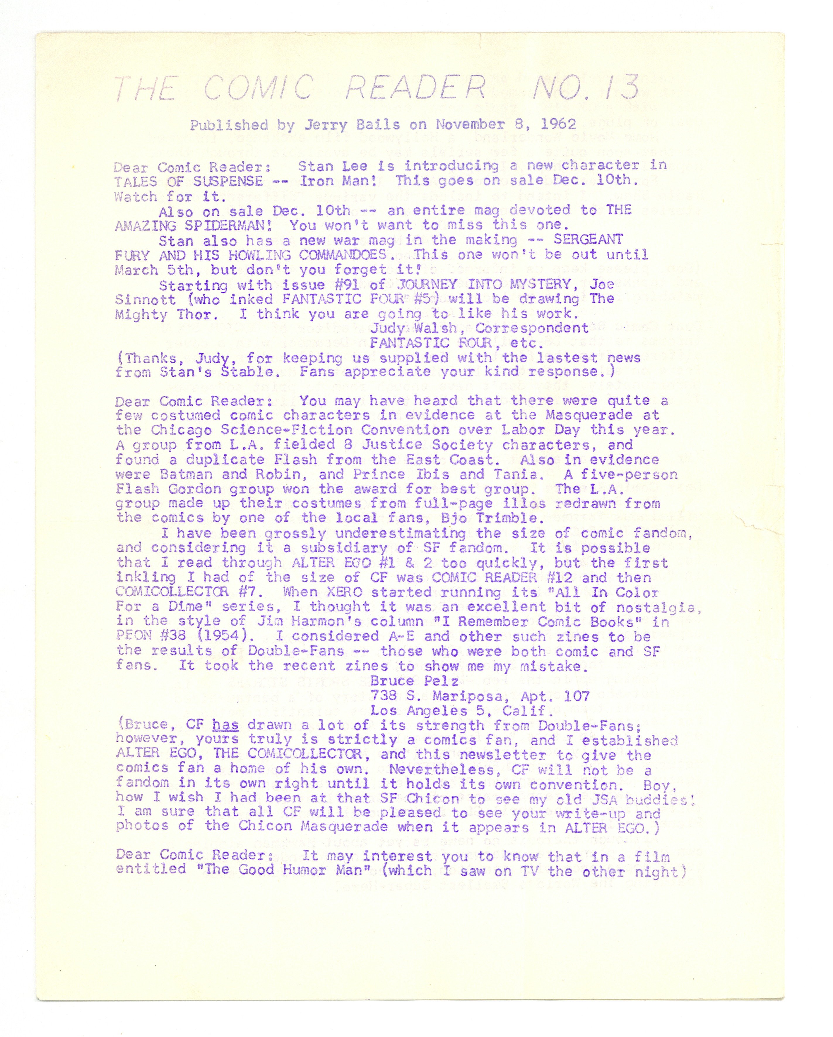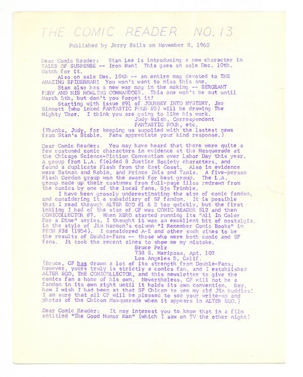 Published Nov 1962 by Jerry G. Bails.$140.00Published by Jerry Bails, the Father of Comic Book Fandom, The Comic Reader was one of the earlier comic book fanzines, making it an important part of comics history. 8.5" x 11", 8 mimeographed pages.