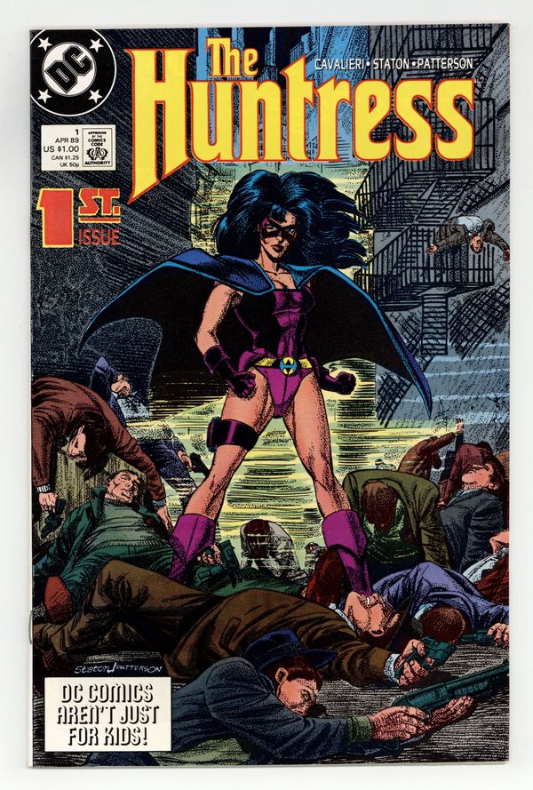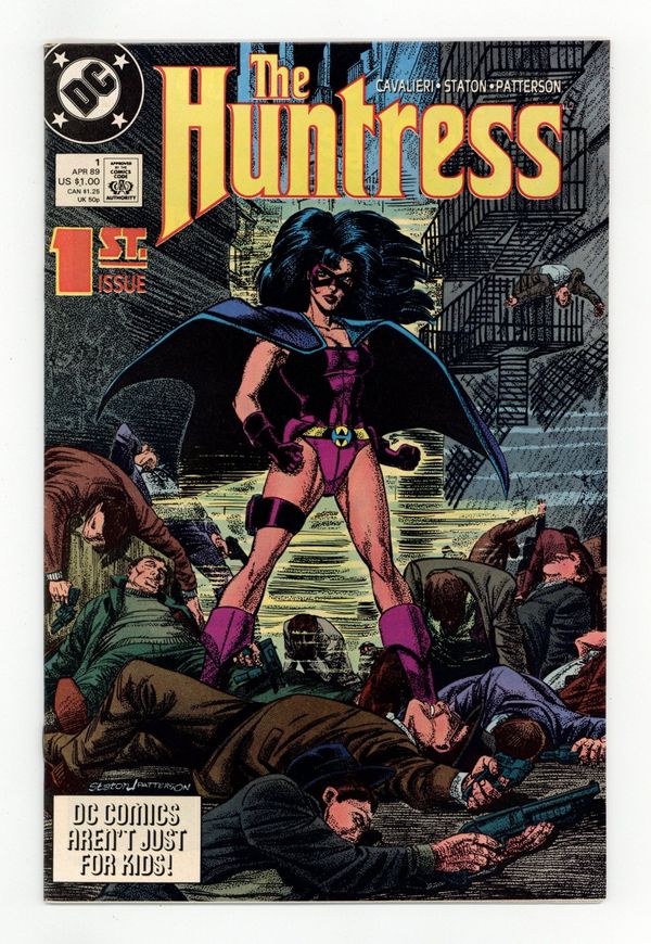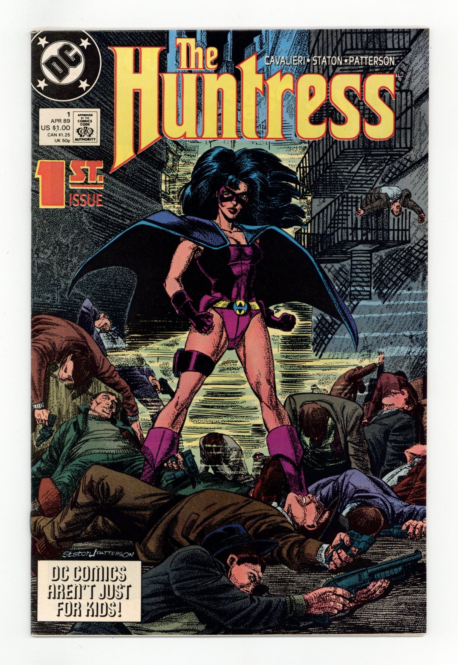 Direct Edition. She stalks the animals who prey on the innocent. She's the new Huntress, a woman for whom all semblance of a normal life ended when she was young. She was kidnapped when she was a child. Her family was murdered by criminals when she was in college. Both events hardened her heart and darkened her outlook. Who is Helena Bertinelli, the woman behind the mask of this all-new version of one of DC's most popular heroines? The story comes together here in THE HUNTRESS #1 as we begin to pierce the deadly "Code of Silence" that surrounds her and the terrible tragedies that have reshaped and redefined her life. Written by Joey Cavalieri, with pencils by Joe Staton and full craft-tint inks by Bruce Patterson. Cover by Staton and Patterson. Note: First appearance of third Huntress (Helena Bertinelli). Cover price $1.00.