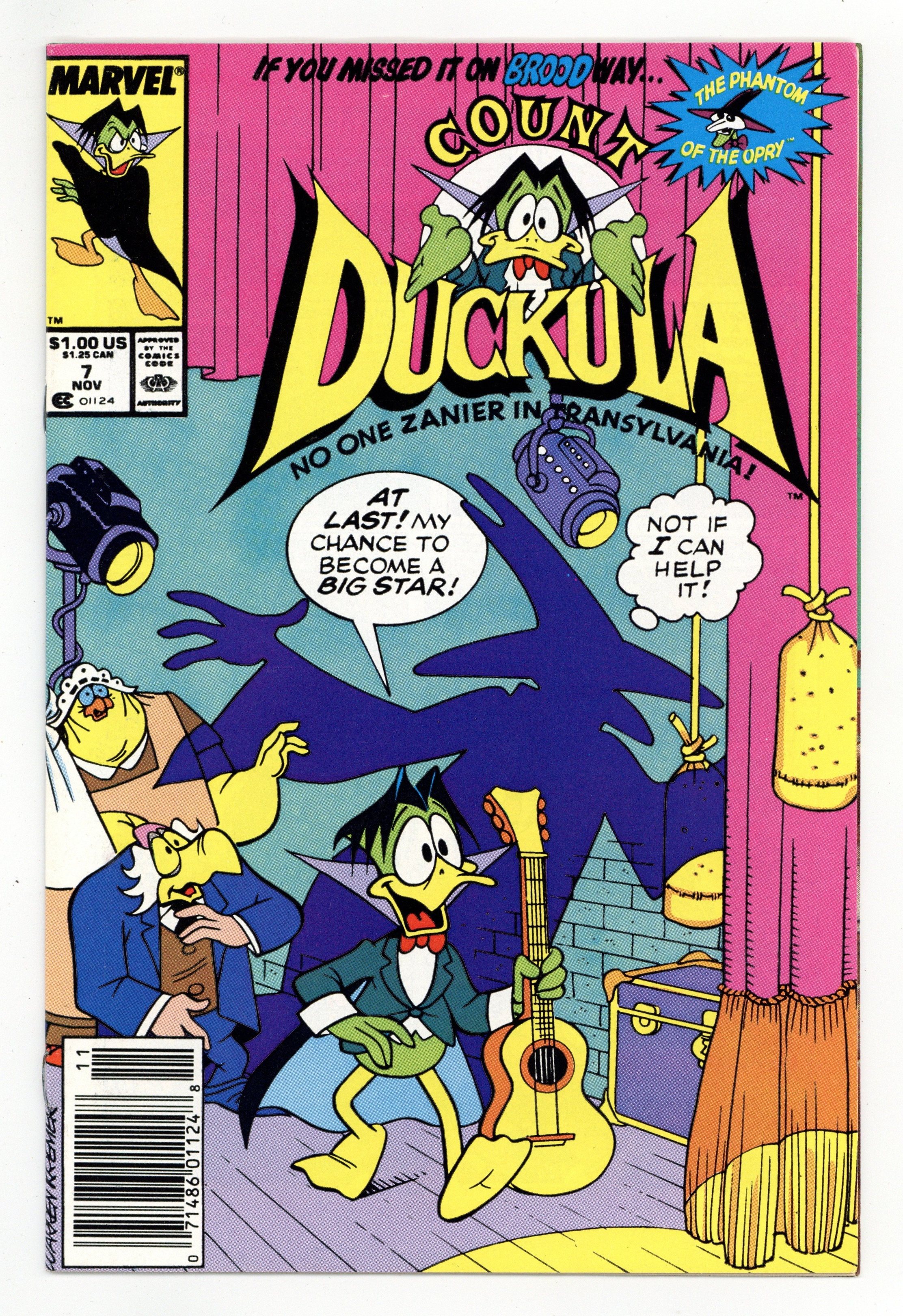Comic book version of the animated series which originally aired in the late 1980s. Count Duckula takes up guitar playing, puts on some cowboy threads and travels to Gnashville to become a country music superstar in "The Phantom of the Grand Ole Opry." And then Danger Mouse is not acting right. Something is causing him to change to different colors in "Color My World." Scripts by Michael Gallagher and art by Warren Kremer. Cover price $1.00.