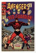 First appearance of the Red Guardian in "Color Him...the Red Guardian!" Part 1 of 2. Script by Roy Thomas. Pencils by John Buscema. Inks by George Roussos (as George Bell). Cover by John Buscema and George Roussos. After receiving a tip concerning the Black Widow's whereabouts, Hawkeye andHercules travel to the Far East to rescue her! But her communist captors have created a super-powered adversary to oppose them: the Red Guardian! Once the Prince of Power and the ace archer arrive in the Middle Kingdom, they defeat the guard force and challenge the Red Guardian! However thecommunist champion is smart and tough! He uses the Psychotron to confuse Hercules -- and next uses his belt weapon to knock out Hawkeye. And then while basking in the glow of his victory, the guardian makes a shocking announcement: Natasha Romanoff is his wife! What a red-letter day for the Red Guardian! Avengers Lineup: Captain America, Goliath, Hawkeye, Hercules, Quicksilver, Scarlet Witch, and the Wasp. (Note: This story was reprinted in Marvel Triple Action #35.) 36 pages. Cover price $0.12.