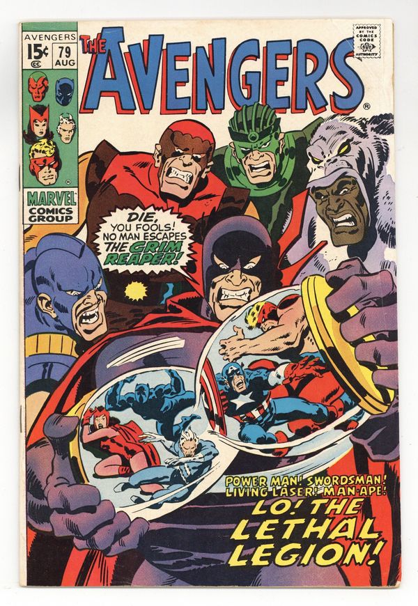 Tags: Marvel Legacy Numbering: Avengers (part 79), Avengers$19.25"Lo! The Lethal Legion!" Part 2 of 2. Script by Roy Thomas. Pencils by John Buscema. Inks by Tom Palmer. Cover by John Buscema. The Grim Reaper is back with a new scheme to destroy the Avengers! And this time Eric Williams has brought along some super-powered helpers: the Swordsman, Living Laser, Power Man, and the Man-Ape! Truly a Lethal Legion! But Earth's Mightiest Heroes have responded by summoning the golden avenger and the thunder god to their ranks! After the Black Panther momentarily escapes and warns his teammates about the reaper's plan, the colossal clash begins! The Mighty Avengers vs. the Lethal Legion in the heart of Avengers Mansion! While the battle rages the Grim Reaper's gang appears to seize the upper hand, but looks can be deceiving! As the Vision will prove! Avengers Lineup: Black Panther, Captain America, Goliath, Iron Man, Quicksilver, Scarlet Witch, Thor, and the Vision. (Notes: The Grim Reaper returns in Avengers 102. The Swordsman appears next in Avengers 100. The Grim Reaper discovers the connection between Wonder Man (aka Simon Williams) and the Vision in this issue. This story was reprinted in 1993 in the trade paperback: The Greatest Battles of the Avengers.) 36 pages. Cover price $0.15.