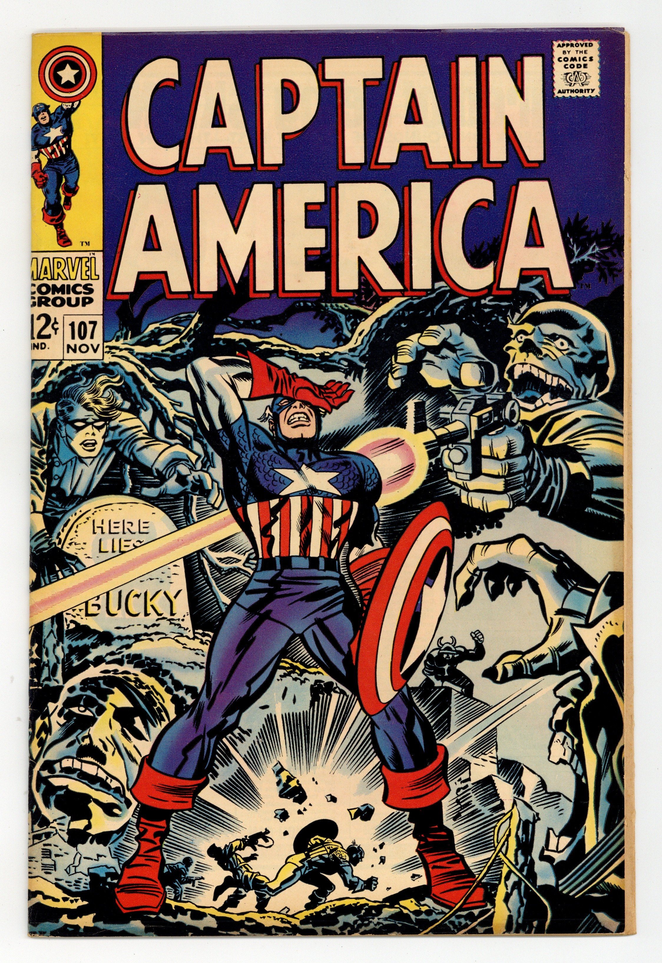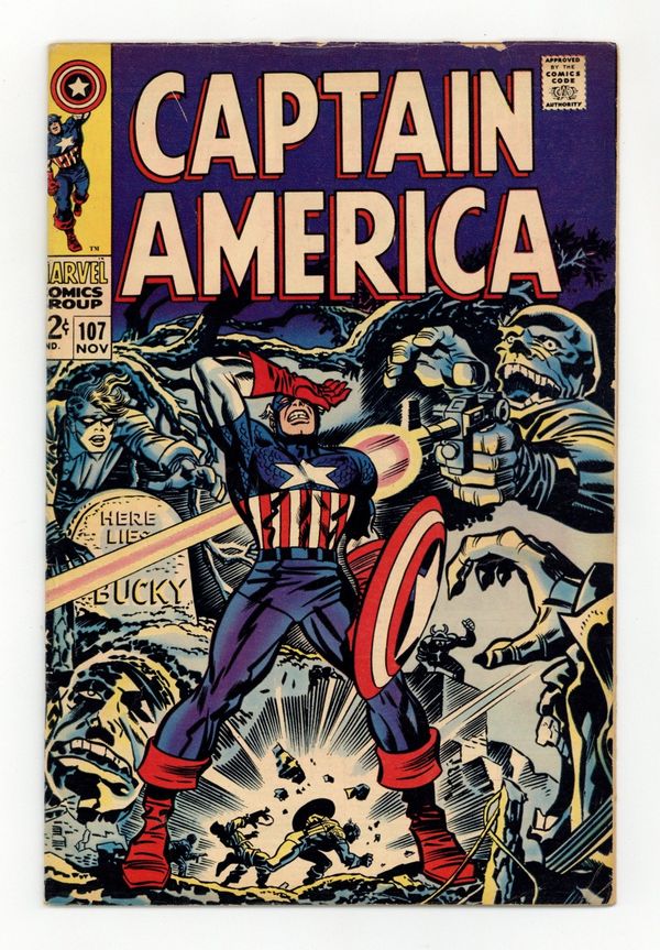 Tags: Marvel Legacy Numbering: Captain America (part 107), Captain America$16.25Cover pencils by Jack Kirby, inks by Frank Giacoia. Cap faces Dr. Faustus (first appearance) in "If the Past Be Not Dead," script by Stan Lee, pencils by Jack Kirby, inks by Syd Shores; Captain American keeps dreaming that hes being chased by demonic looking Nazi soldiers; Cap comes across the grave of his old sidekick Bucky Barnes; Cap calls his psychiatrist Dr. Faustus to tell him that he keeps having the same dream; Cap battles Dr. Faustus; Cameos by the Red Skull and Bucky Barnes. Letter to the editor from comics historian Peter Sanderson Jr. 36 pgs., full color. $0.12. Cover price $0.12.