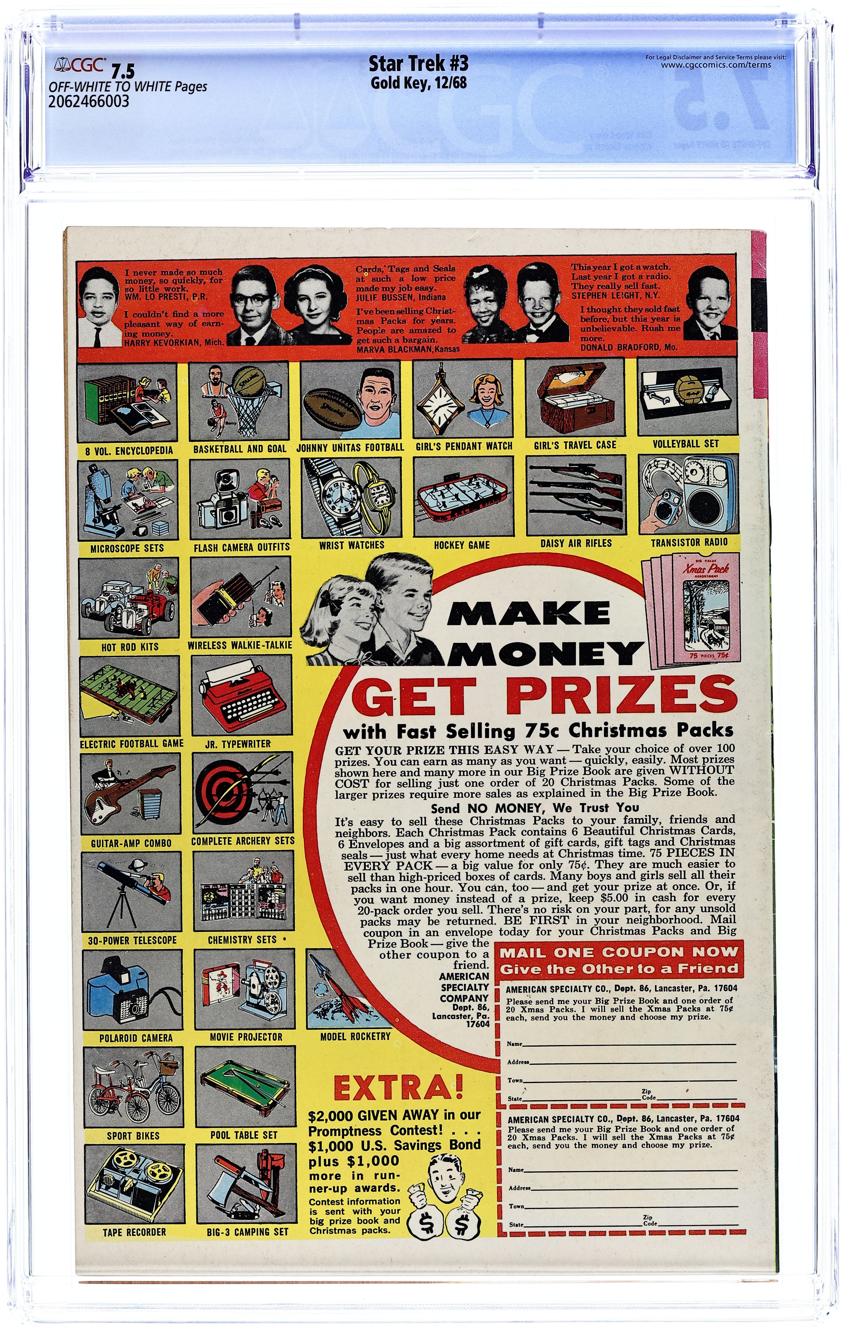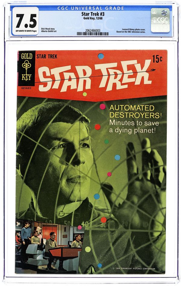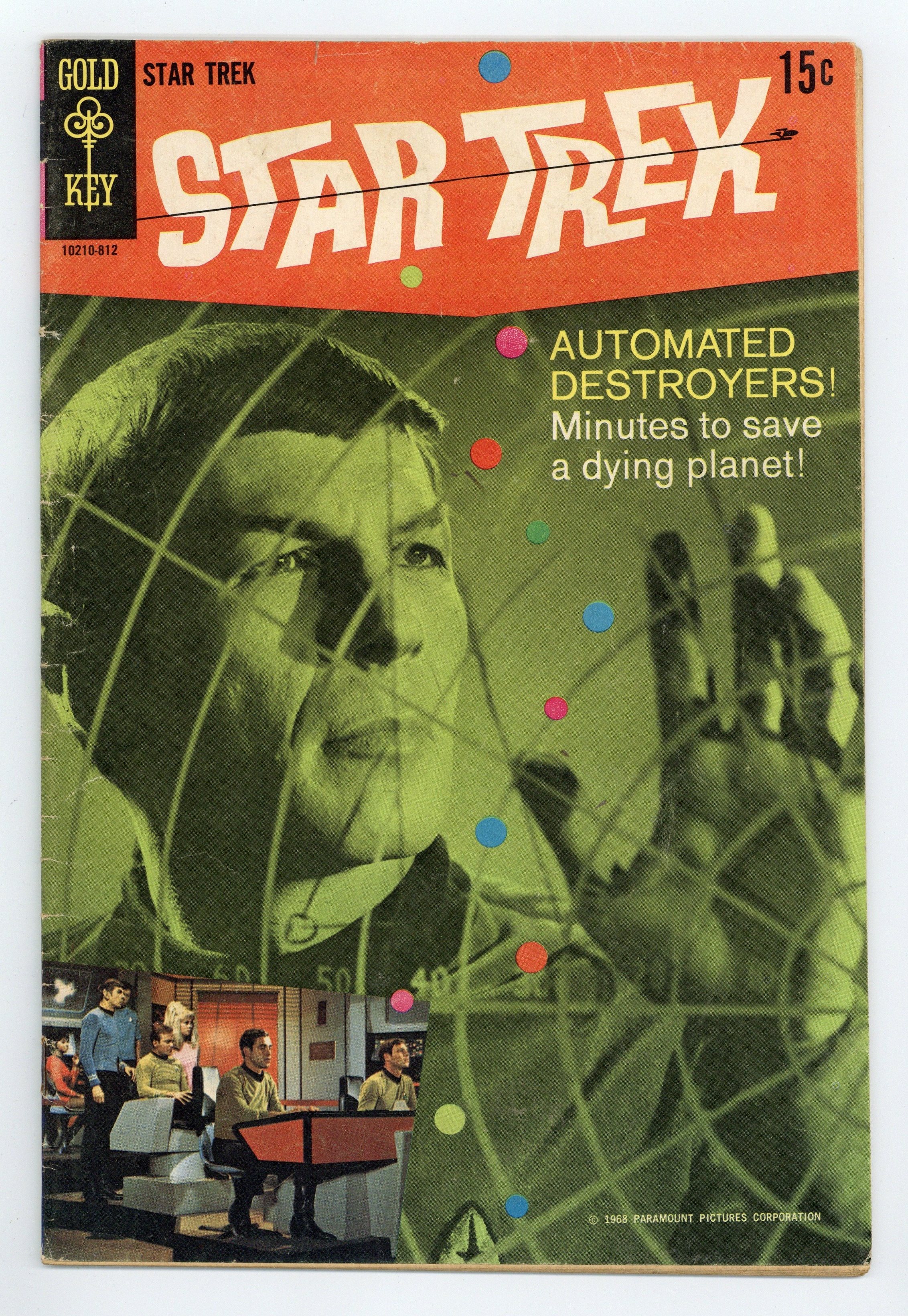 Comic book version of the original Star Trek TV series that starred William Shatner and Leonard Nimoy. Photo cover of Leonard Nimoy. NOTE: There are 2 versions of this comic. This version has an ad on the back cover. The other version has a photo back cover. "Part I: Invasion of the City Builders," script by Dick Wood, art by Alberto Giolitti; The planet Zarta has been taken over by their own technology; Machines that built their city have not stopped and have nearly filled the planet with one large vacant city. "Part II: The Bridge to Catastrophe," script by Dick Wood, art by Alberto Giolitti; When the Enterprise Crew show up they are quick to help the remaining people the best they can. 36 pgs., full color. $0.15. Cover price $0.15.