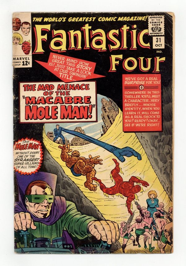 Cover pencils by Jack Kirby, inks by Chic Stone. The Mad Menace of the Macabre Mole Man!, script by Stan Lee, pencils by Jack Kirby, inks by Chic Stone; Mole Man lowers blocks of New York City into his realm; Sue is injured in the ensuing battle and can only be saved by a surgery performed by her escaped felon father. 36 pgs. $0.12. Cover price $0.12.