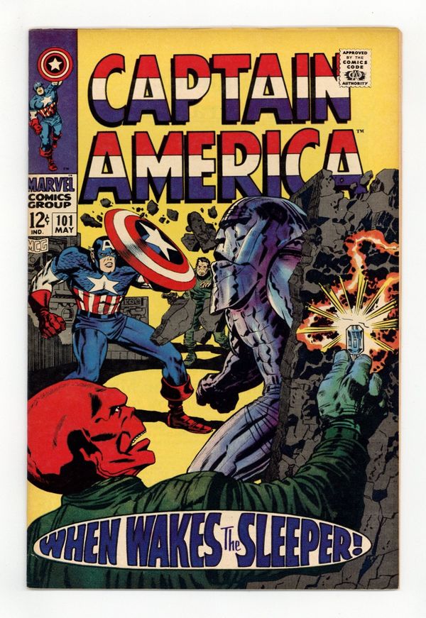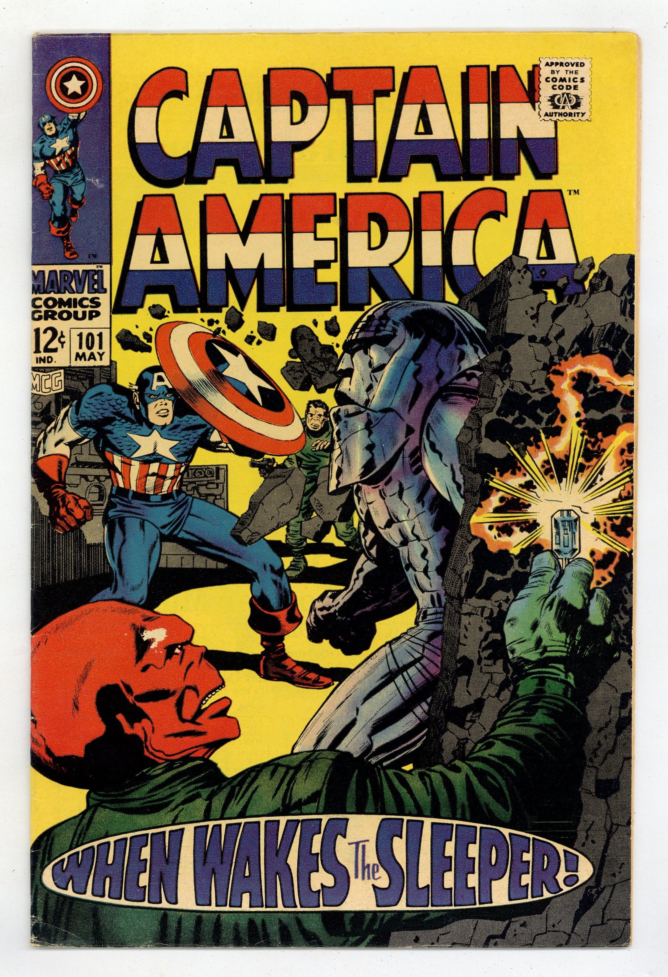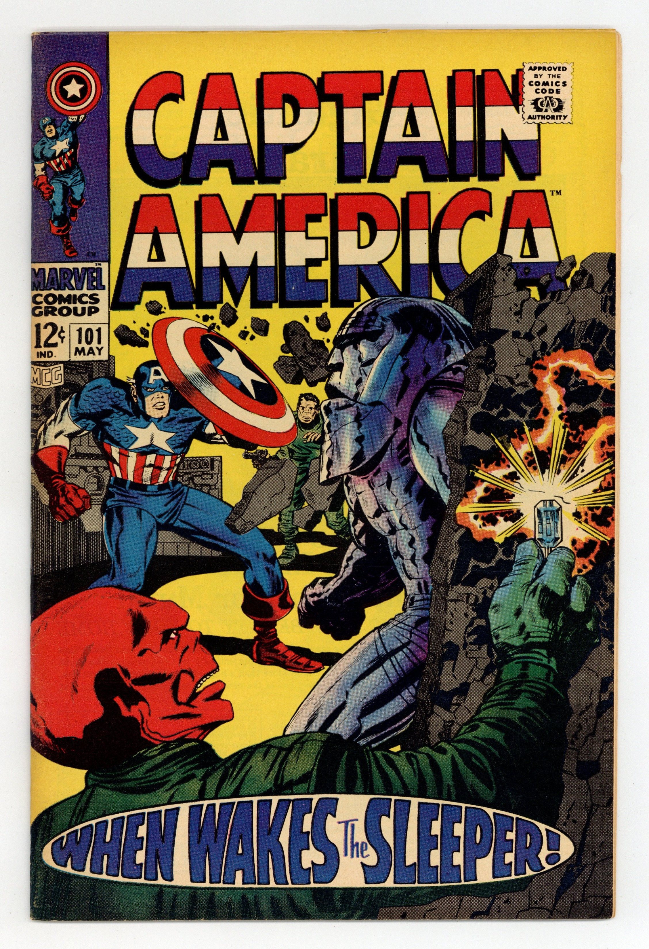 Tags: Marvel Legacy Numbering: Captain America (part 101), Captain America$36.00Cover pencils by Jack Kirby and John Romita (alterations), inks by Syd Shores and John Romita. Cap faces the Red Skull and the fourth Sleeper in "When Wakes the Sleeper!", script by Stan Lee, pencils by Jack Kirby, inks by Syd Shores; Captain America attacks a jeweler who he recognizes to be Nazi war criminal Werner Von Krimm; Nick Fury stops the fight and lets Krimm go, much to the Captains chagrin; Red Skull is hiding out at a secret base in the Florida Keys with henchmen, looking to awaken a fourth Sleeper robot; Von Krimm has the key to activate that robot; Nick Fury guest appearance. 36 pgs., full color. $0.12. Cover price $0.12.