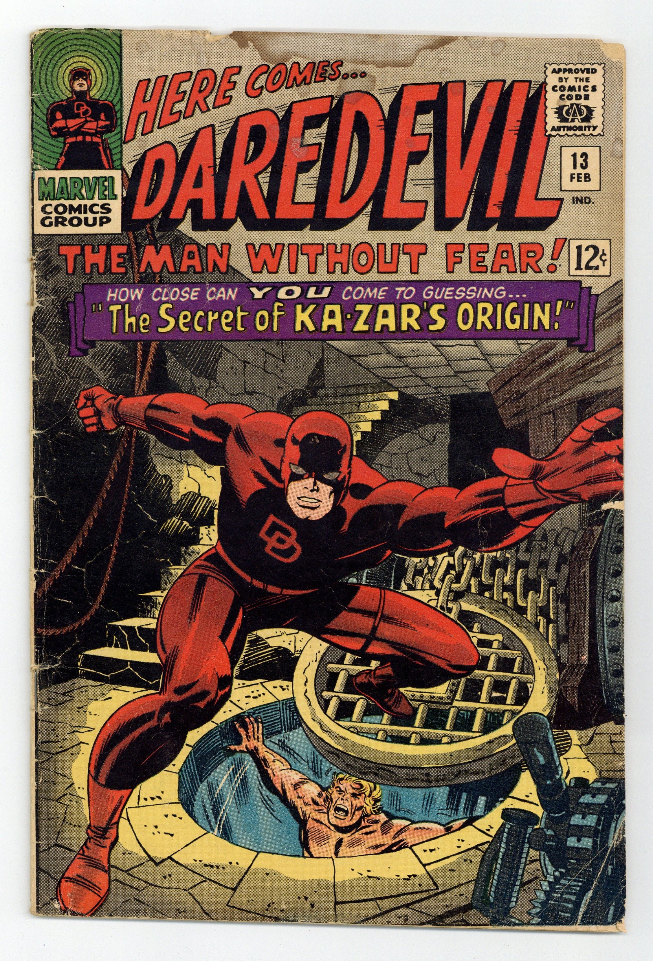 Cover pencils by Jack Kirby, inks by Mike Esposito and John Romita (heavy re-touching). Ka-Zar guest stars in The Secret of Ka-Zar's origin!, script by Stan Lee, breakdowns by Jack Kirby, finished art by John Romita Sr.; DD and Ka-Zar battle the Plunderer as the villain regales them with his origin and the origin of his savage brother; The Plunderer is after half of a necklace that his father gave the two brothers that will open a vault to a substance that destroys all weaponry; Everybody gets greedy and even the pirates and the butler vie for the halves of the medallion. 36 pgs. Cover price $0.12. Cover price $0.12.