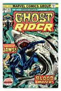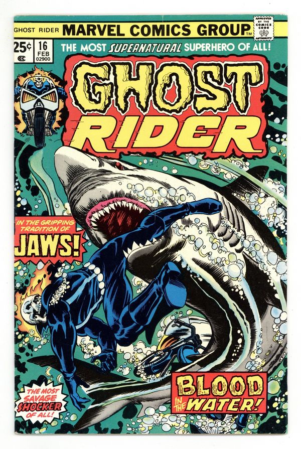 Tags: Ghost Rider$16.50"Blood in the Waters!" Story by Bill Mantlo. Art by George Tuska and Vince Colletta. Cover by Bob Brown and Dave Cockrum. A boating accident sets the Spirit of Vengeance against the deadliest creature to ever swim in the ocean - the Great White Shark! 32 pages, FC. NOTE: The letters page also contains Marvel Value Stamp series B #3: the Human Torch. Spider-Man stars in a one-page Hostess ad, "The Kidnap Caper." And a letter to the editor from David Lynch (no, no, not the film director). Cover price $0.25.