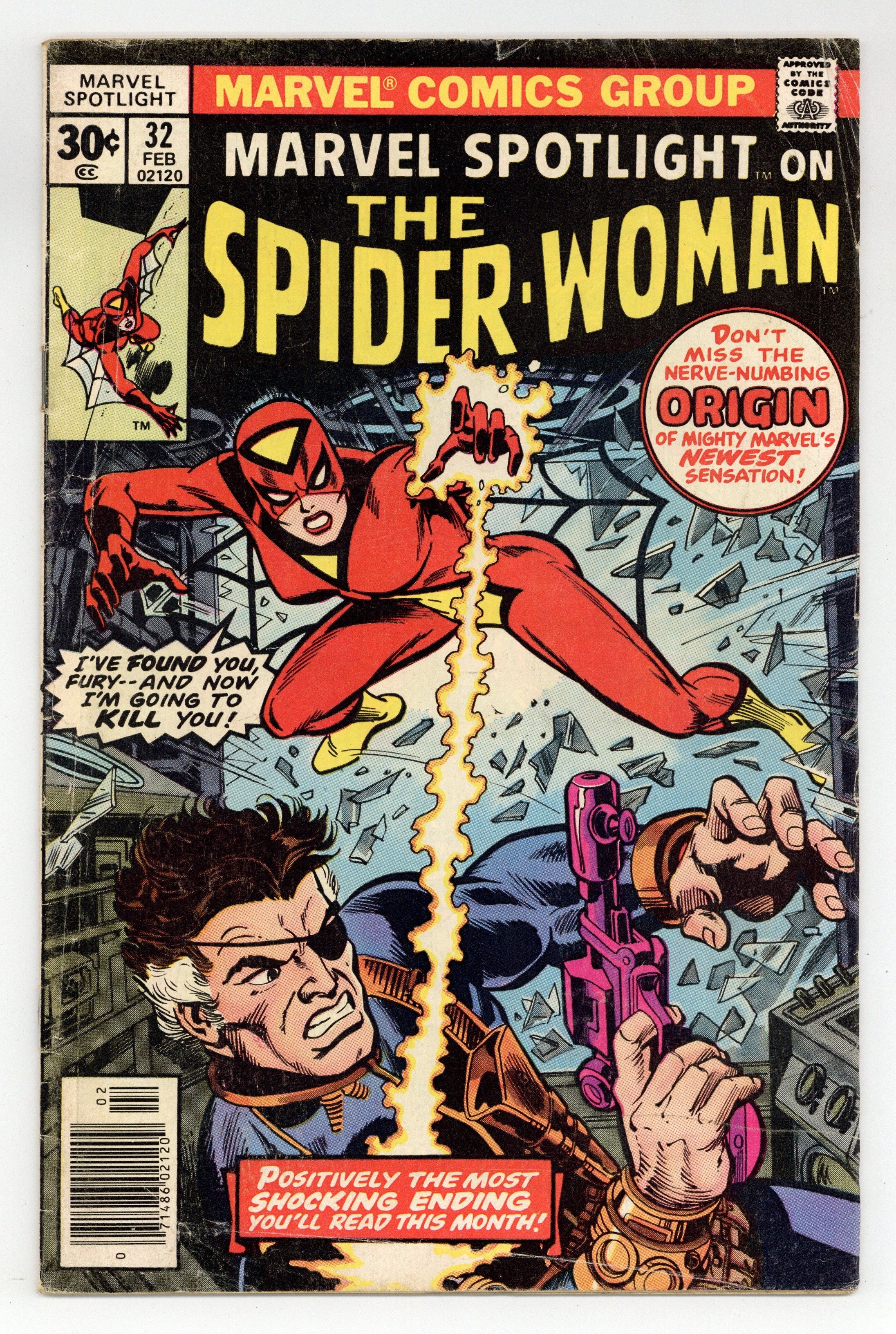 Ends Apr 27 8:43 PM CST Bid History 4 bids Current Bid $16 Your Secret Max Bid If you'd like to bid, please log in or register. Origin and 1st appearance of Spider-Woman. Cover pencils by Gil Kane and John Romita (alterations), inks by Dick Giordano (?) and John Romita (alterations). Dark Destiny!, script by Archie Goodwin, pencils by Sal Buscema (breakdowns) and Jim Mooney (finished art), inks by Jim Mooney; the mysterious Spider-Woman is tricked by Hydra into trying to kill Nick Fury. Continued in Spider-Woman #1. 36 pages, full color. Cover price $0.30.