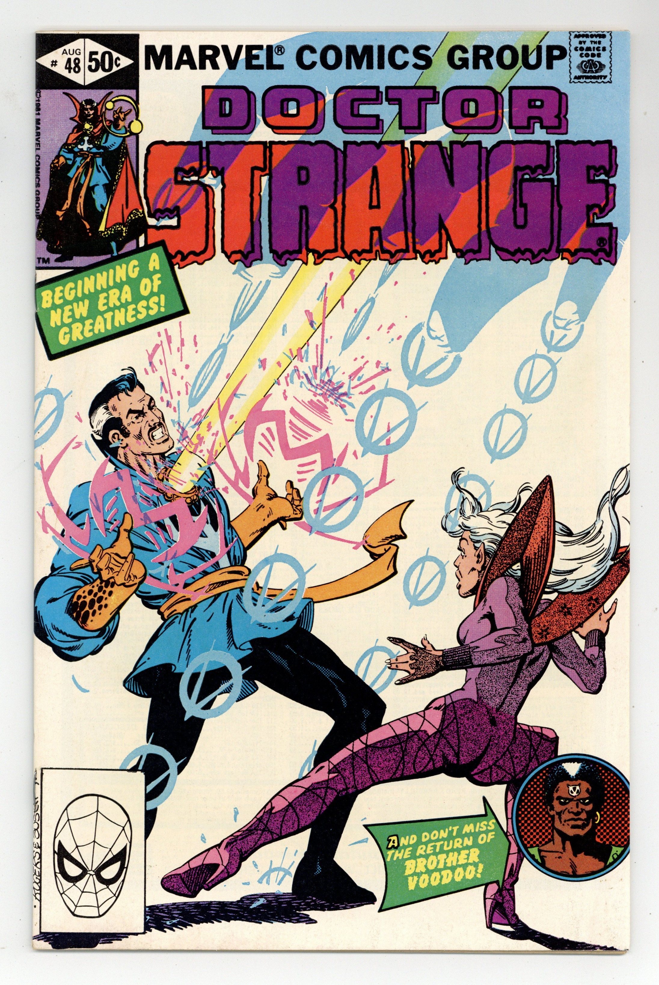 Starts Mar 23 Direct Edition. Cover pencils by Marshall Rogers, inks by Terry Austin. The Power of Dr. Strange!, script by Roger Stern, pencils by Marshall Rogers (breakdowns) and Terry Austin (finished art), inks by Terry Austin; origin recap of Brother Voodoo; Strange battles Damballah; intro Morganna Blessing, a passer-by with a slight ability in the occult who becomes a supporting character. 36 pgs. $0.50. Cover price $0.50.