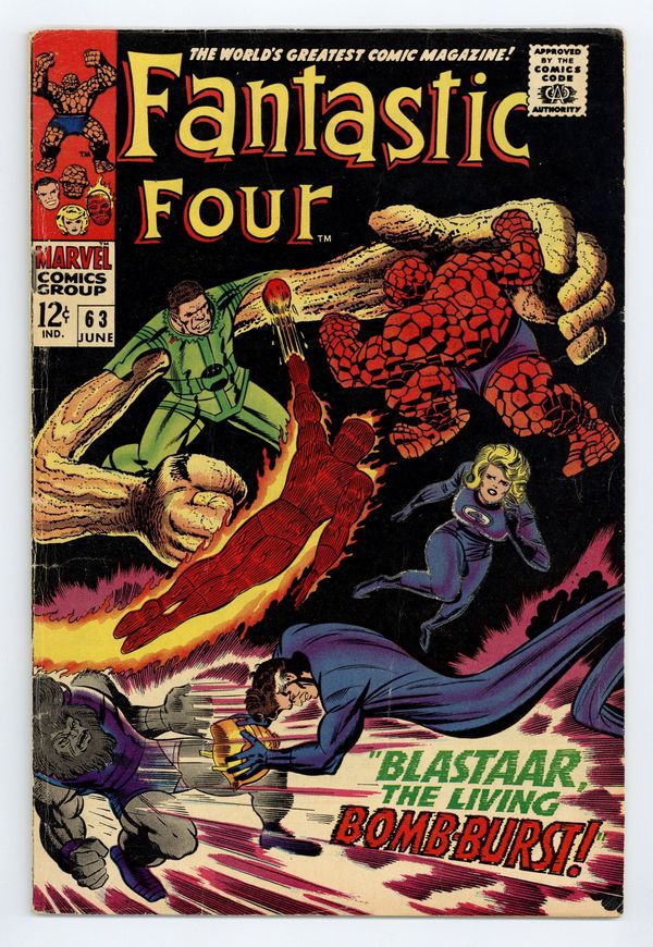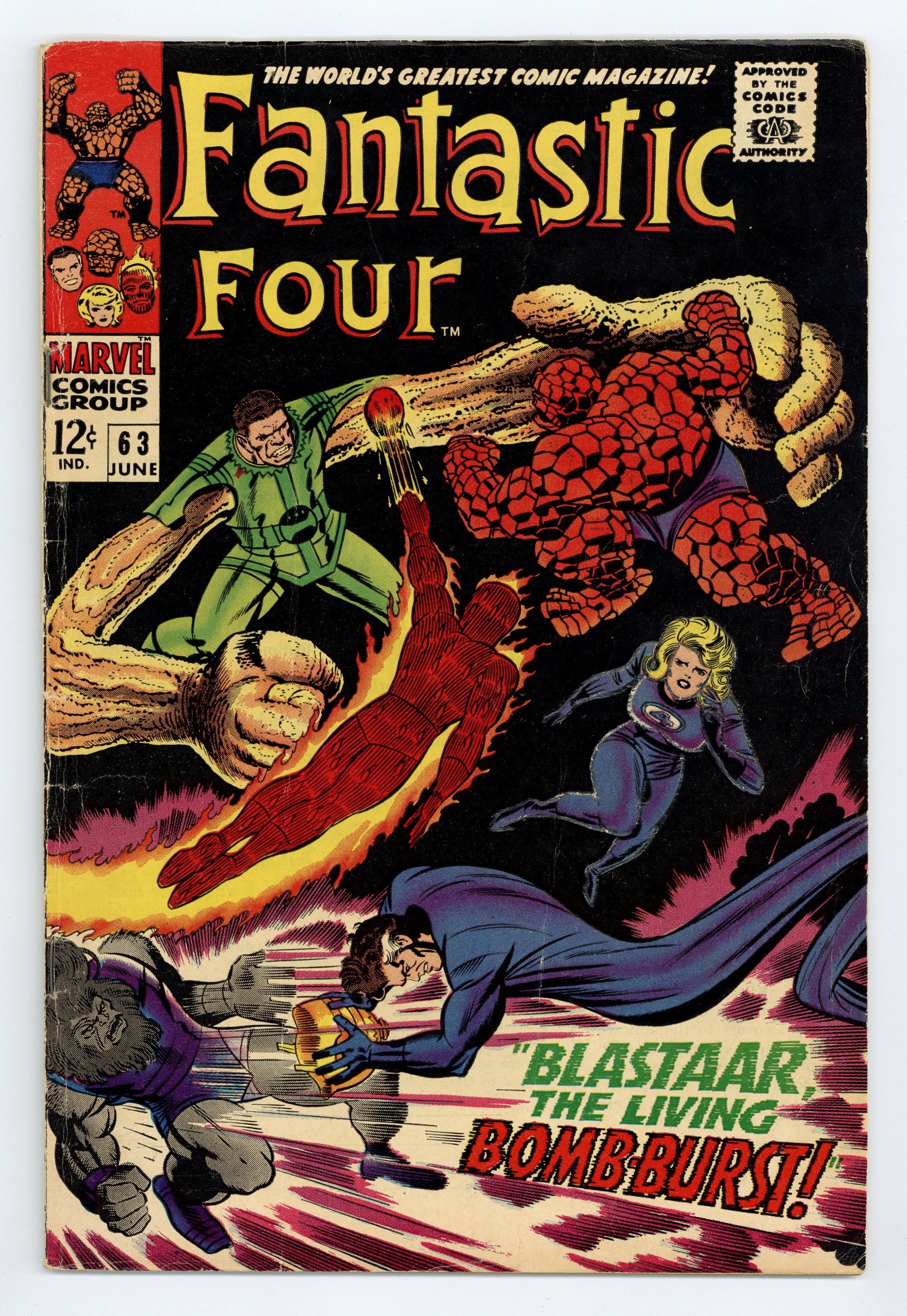 Cover pencils by Jack Kirby, inks by Joe Sinnott. Blastaar, the Living Bomb-Burst!, script by Stan Lee and Jack Kirby (co-plot), pencils by Jack Kirby, inks by Joe Sinnott; The FF battle Blastaar and the Sandman, who have teamed up; Reed puts a helmet on Blastaars head to prevent his explosions. Triton and Crystal (of the Inhumans) appearances. Reprinted in Marvel's Greatest Comics # 46. 36 pgs. $0.12. Cover price $0.12.