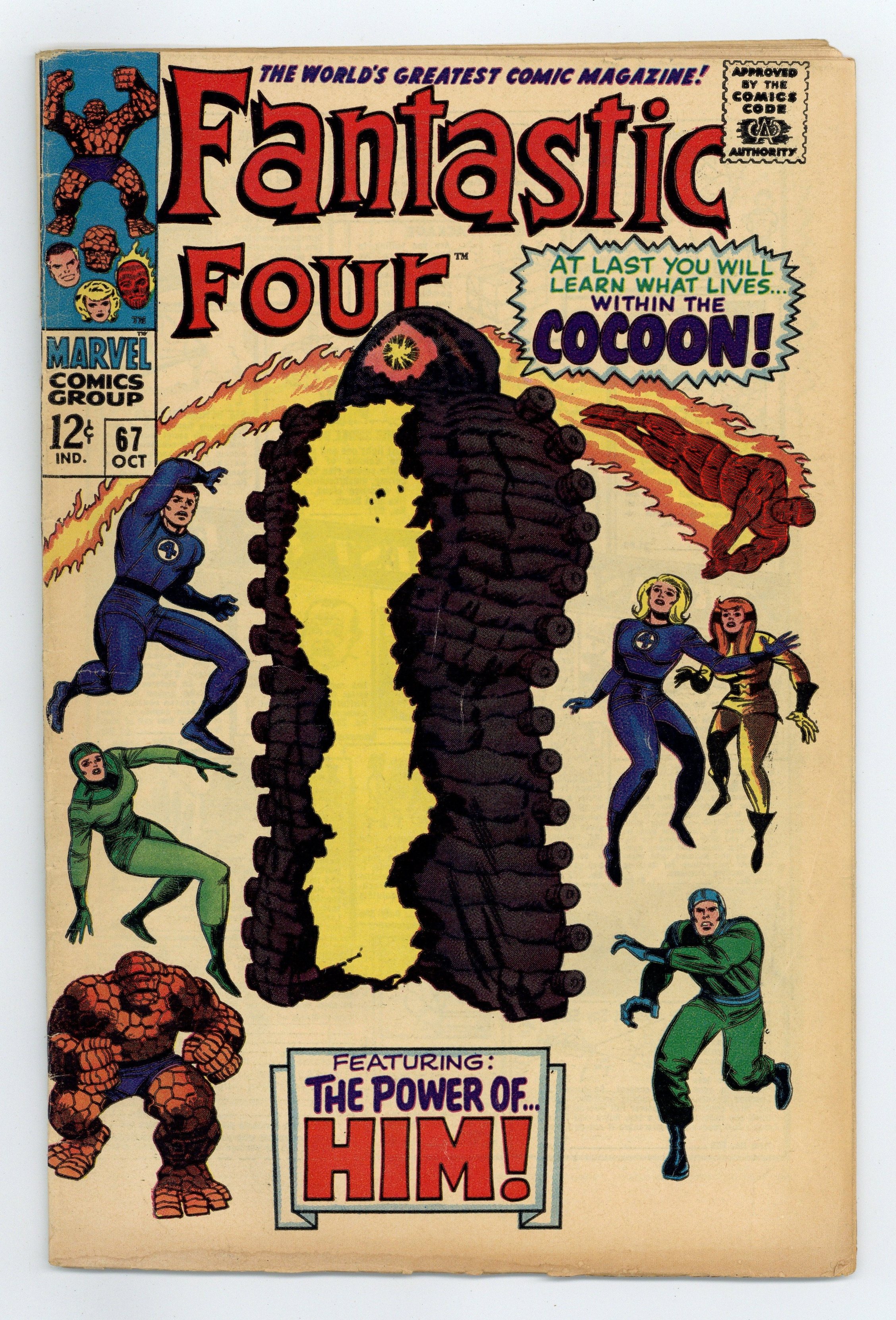1st printing. Cover pencils by Jack Kirby, inks by Joe Sinnott. Origin (part 2) and first appearance of Him (Warlock) in "When Opens the Cocoon!", script by Stan Lee and Jack Kirby (co-plot), pencils by Jack Kirby, inks by Joe Sinnott; The FF track the kidnapped Alicia to the Beehive, where the cocoon opens and reveals Him. Crystal (of the Inhumans) appearance. 36 pgs. $0.12. NOTE: 1994 JC Penney reprint exists. Can be identified by having a Stridex ad on the back cover. Cover price $0.12.