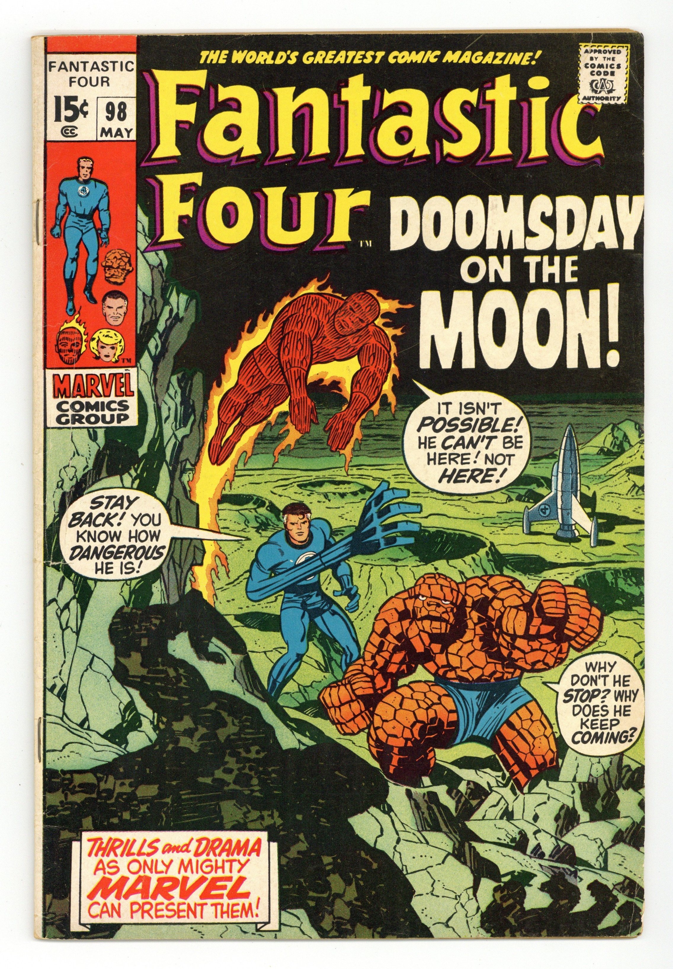 Tags: Fantastic Four$19.25"Mystery on the Moon!" Script by Stan Lee. Pencils by Jack Kirby. Inks by Joe Sinnott. Cover by Jack Kirby and Joe Sinnott. In his Baxter Building laboratory, Mr. Fantastic intercepts a cryptic message from the Kree empire! Reed and his fantastic partners aren't exactly sure what it means, but they think it's related to NASA's upcoming lunar landing at Tranquility Base! While the Apollo 11 mission blasts off from the Kennedy Space Center, the Fantastic Four take off for the South Pacific to find the Earth source of the mysterious transmission! Upon arriving at a suspicious island, the FF discover an old enemy…Sentry 459. The Kree sentry plans to sabotage America's moon landing! But the FF can't let that happen! If Ben Grimm can take one small step for a man, Neil Armstrong will take one giant leap for mankind! Cameo appearances by Alicia Masters, Franklin, and Neil Armstrong. (Note: Sentry 459 appears next in Avengers 89.) 36 pages Cover price $0.15.