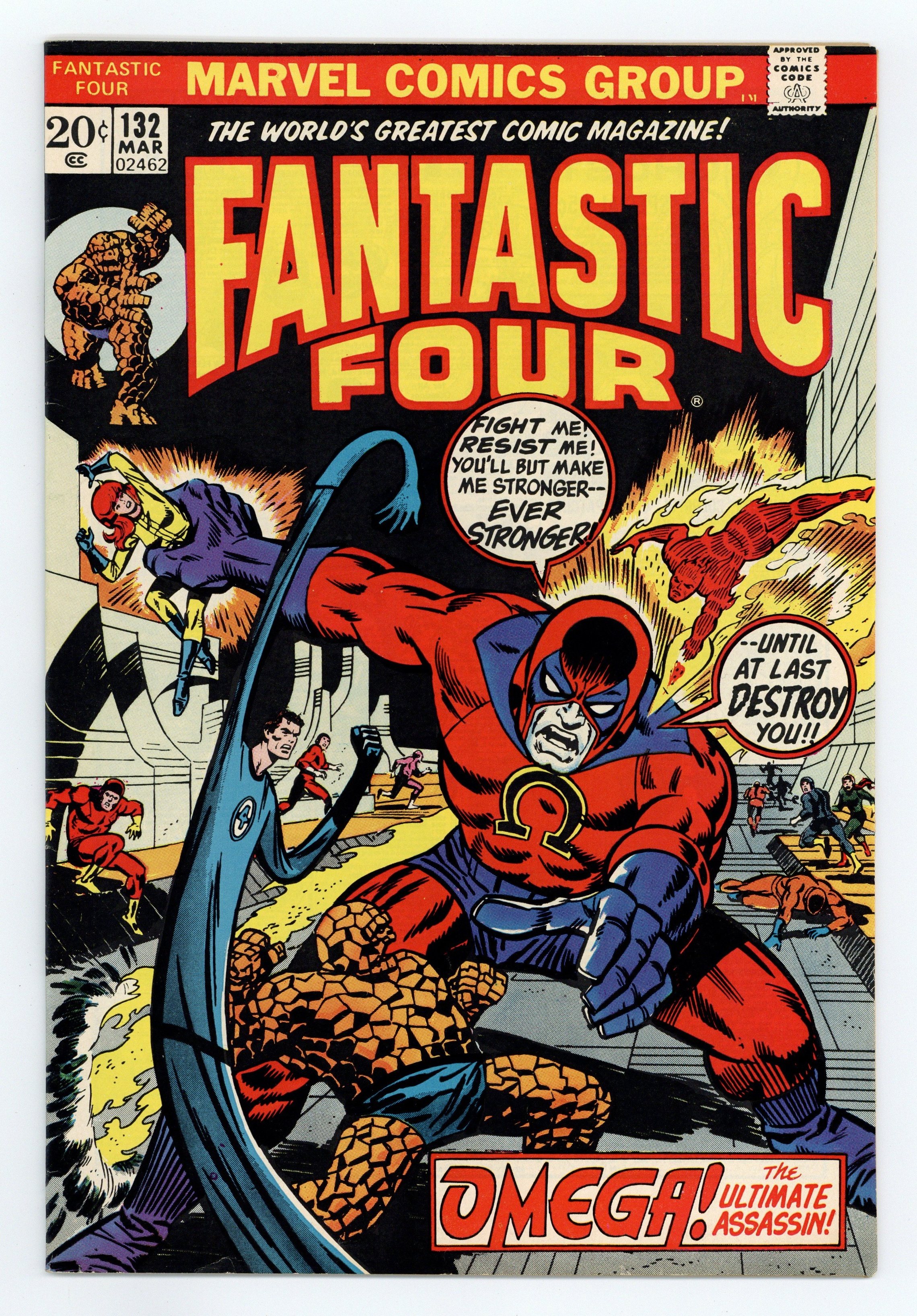 "Omega! The Ultimate Enemy!" Part 2 of 2. Guest-starring Quicksilver and the Inhumans. Script by Roy Thomas. Art by John Buscema (breakdowns) and Joe Sinnott (finishes). Cover by Jim Steranko and Frank Giacoia. In the underground lair of the Alpha Primitives, the awesome Omega has seized Crystal! And now the Human Torch and Quicksilver must join forces to set her free! However, the massive android is powerful indeed! It's going to take all of the Inhumans plus Mr. Fantastic and the Thing to stop the invasion of the Alpha Primitives! Can the FF and the royal family defeat the Alphas and Omega? But even if the heroes win, Johnny Storm is still going to lose. (Notes: The Human Torch changes his costume from blue to red in this issue, and Medusa joins the Fantastic Four (through issue 159). The letters page contains a statement of ownership: average print run 457,990; average paid circulation 245,695.) 36 pages Cover price $0.20.