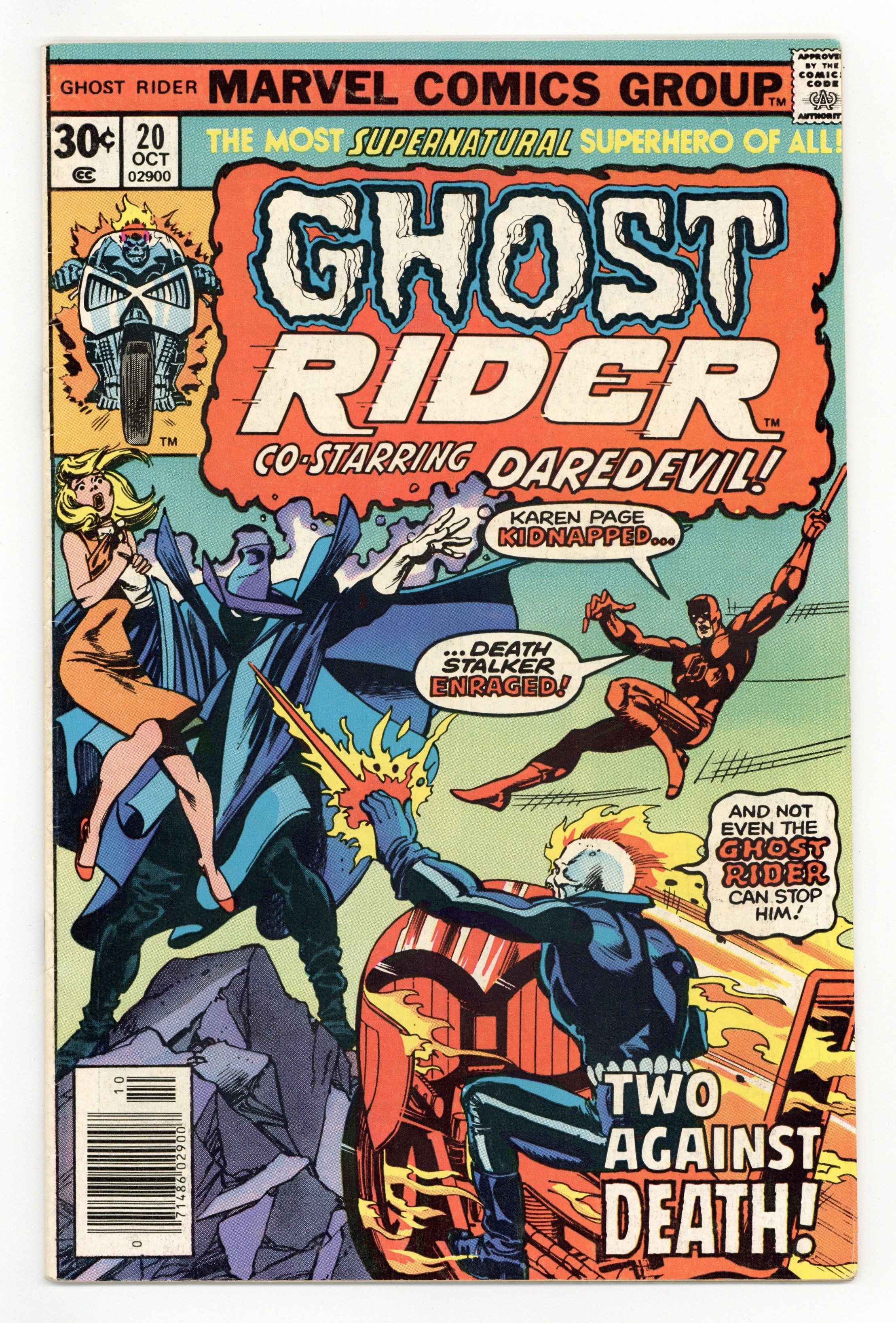 First 30-cent cover price - Part 5 of 5 - "Two Against Death!" Guest-Starring Daredevil, Stunt Master and Karen Page. Story by Marv Wolfman. Art by John Byrne and Don Perlin. Cover by Gil Kane and Klaus Janson. Story continued from Daredevil (1964-1998 1st Series) #138. the Spirit of Vengeance must team-up with the Man without Fear to save the beautiful Karen Page from the menacing Death-Stalker! 32 pages, FC. Cover price $0.30.