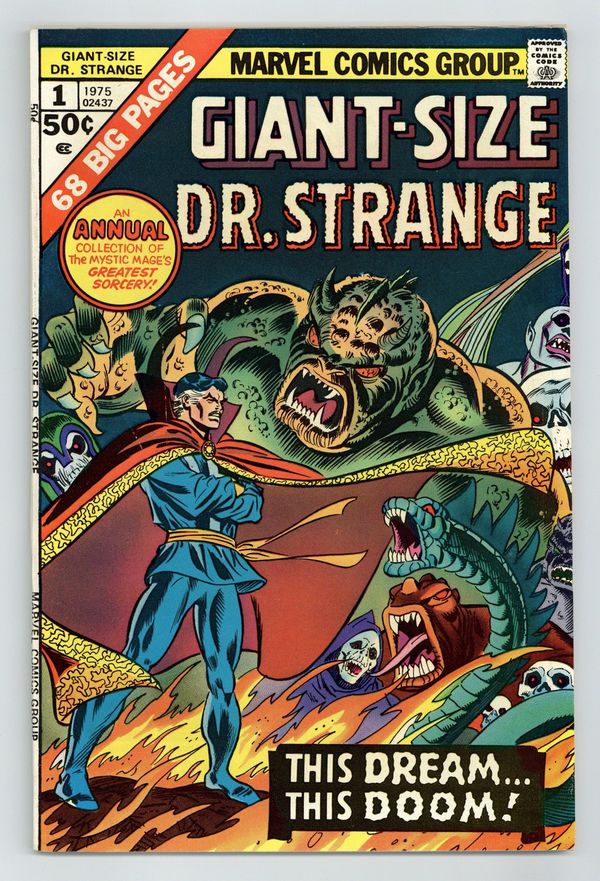 $15.50Cover pencils by Gil Kane. "Nightmare!" (reprinted from Strange Tales #164), script by Jim Lawrence and Dan Adkins (co-plot), art by Dan Adkins; Hurling thru the void of space, Strange sees a vision of Victoria Bentley, surrounded by machinery; So he's taken back when he lands on a jungle planet inhabited by savage, monstrous creatures. "The Mystic and the Machine!" (reprinted from Strange Tales #165), script by Jim Lawrence and Dan Adkins (co-plot), art by Dan Adkins; Strange continues thru the underground tunnel until he comes to a large set of doors. Upon getting them open, he finds a disintegrator ray is waiting for him; After he takes it out with the Flames of Faltine, Yandroth realizes his magic is more potent than he calculated, and uses an Ultra-Spectrum Laser to incinerate Strange's brain. "Nothing Can Halt... Voltorg!" (reprinted from Strange Tales #166), script by Jim Lawrence and Dan Adkins (co-plot), pencils by George Tuska, inks by Dan Adkins; A running battle ensues between Strange and the lightning-hurling Voltorg, which nearly destroys Yandroth's lab before Strange finally takes it out; Yandroth grabs Victoria and uses a "Teleportation" machine to instantly send the two of them to a far-distant world. "This Dream--This Doom!" (reprinted from Strange Tales #167), script by Denny O'Neil and Dan Adkins (co-plot), art by Dan Adkins; The Ancient One is alive and tells Strange he made Zom believe he was dead so he could pass on his powers to his disciple; With the Cosmic Balance restored he was able to shatter the spell that bound him; In his Himalayan retreat Strange and the Ancient One discover that Victoria Bentley is a prisoner in the Dimension of Dreams. "Exile!" (reprinted from Strange Tales #168), script b Denny O'Neil and Dan Adkins (co-plot), art by Dan Adkins; Yandroth's shot sends Strange plunging into the abyss, but the Ancient One uses the Trans-Hypnotic Jewel to arrest his fall; Strange uses his Cloak of Levitation to grab Yandroth, but sees the Viking women about to kill Victoria. 68 pgs., full color. Cover price $0.50.