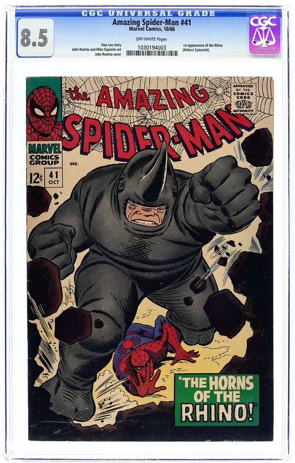 Tags: Marvel Legacy Numbering: Amazing Spider-Man (part 41), Spider-Man$485.00Cover pencils by John Romita Sr., inks by Mike Esposito and John Romita (touch-ups). First appearance of the Rhino in The Horns of the Rhino!, script by Stan Lee, pencils by John Romita Sr., inks by Mike Esposito (as M. Demeo) and John Romita Sr. (touch-ups); The Rhino attempts to kidnap John Jameson to turn him over to foreign powers that want his secrets about the U.S. space program; Spider-Man manages to stop the Rhino. Reprinted in Marvel Tales # 30 and 190. 36 pgs., full color. $0.12. Cover price $0.12.