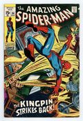 "The Kingpin Strikes Back!" Part 2 of 3. Script by Stan Lee. Art by John Romita (layouts), John Buscema (pencils), and Jim Mooney (inks). Cover by John Romita. The Kingpin has grown tired of sitting on the sidelines. So he prepares to strike back against the Schemer! But the Schemer beats the big crime boss to the punch and invades Wilson Fisk's palatial manor! Once inside he confronts the Kingpin...and then he sees Vanessa Fisk -- the Kingpin's wife! The tension in the room could be cut with a knife...until the web-slinger crashes thru the window! And as shown on the brilliant cover, the wall-crawler and the Kingpin wage war in the mansion...while the Schemer deftly slips away. Both Spider-Man and the Kingpin will be left empty-handed on this night. Cameo appearances by Captain Stacy and Gwen Stacy. (Note: This story was reprinted in Marvel Tales #65.) 36 pages. Cover price $0.15.