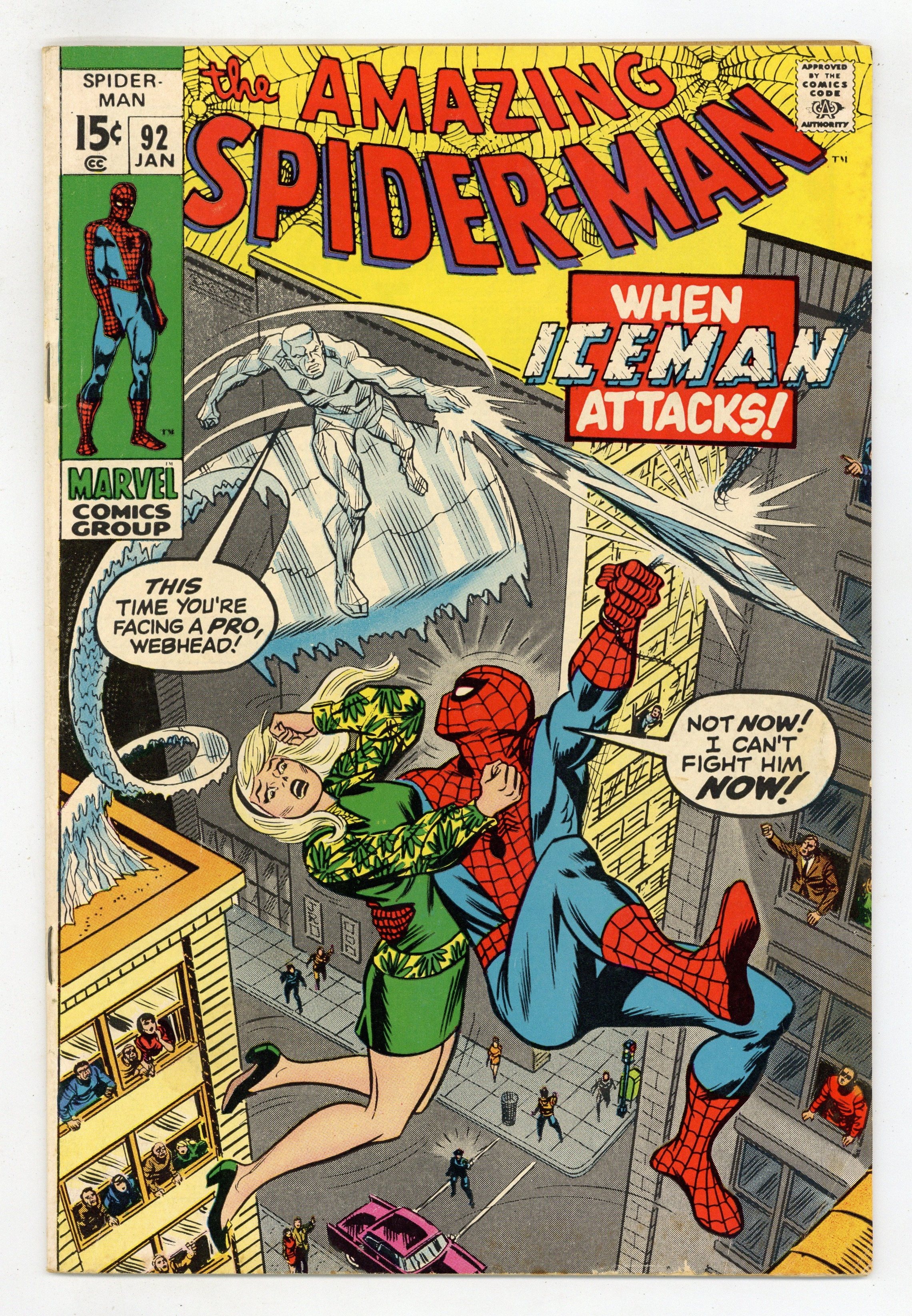 "When Iceman Attacks" Part 2 of 2. Guest-starring Iceman. Script by Stan Lee. Pencils by Gil Kane. Inks by John Romita and Tony Mortellaro (backgrounds). Cover by John Romita. In a surprising move, Spider-Man absconds with Gwen Stacy to keep her away from the deceitful Sam Bullit. The web-slinger would never harm his dear girlfriend, but a young man standing on the sidewalk named Bobby Drake doesn't know that. So when Iceman (of the original X-Men) sees Gwen in apparent distress, he zooms to the rescue! However the wall-crawler doesn't have time to fight Iceman, because he's just watched Sam Bullit's goons abduct Joe Robertson! Can the web-slinger convince Iceman to fight with him instead of against him? Robbie's life depends on it! Cameo appearance by J. Jonah Jameson. (Notes: Marie Severin designed the preliminary cover. This story was reprinted in Marvel Tales #73.) 36 pages. Cover price $0.15.