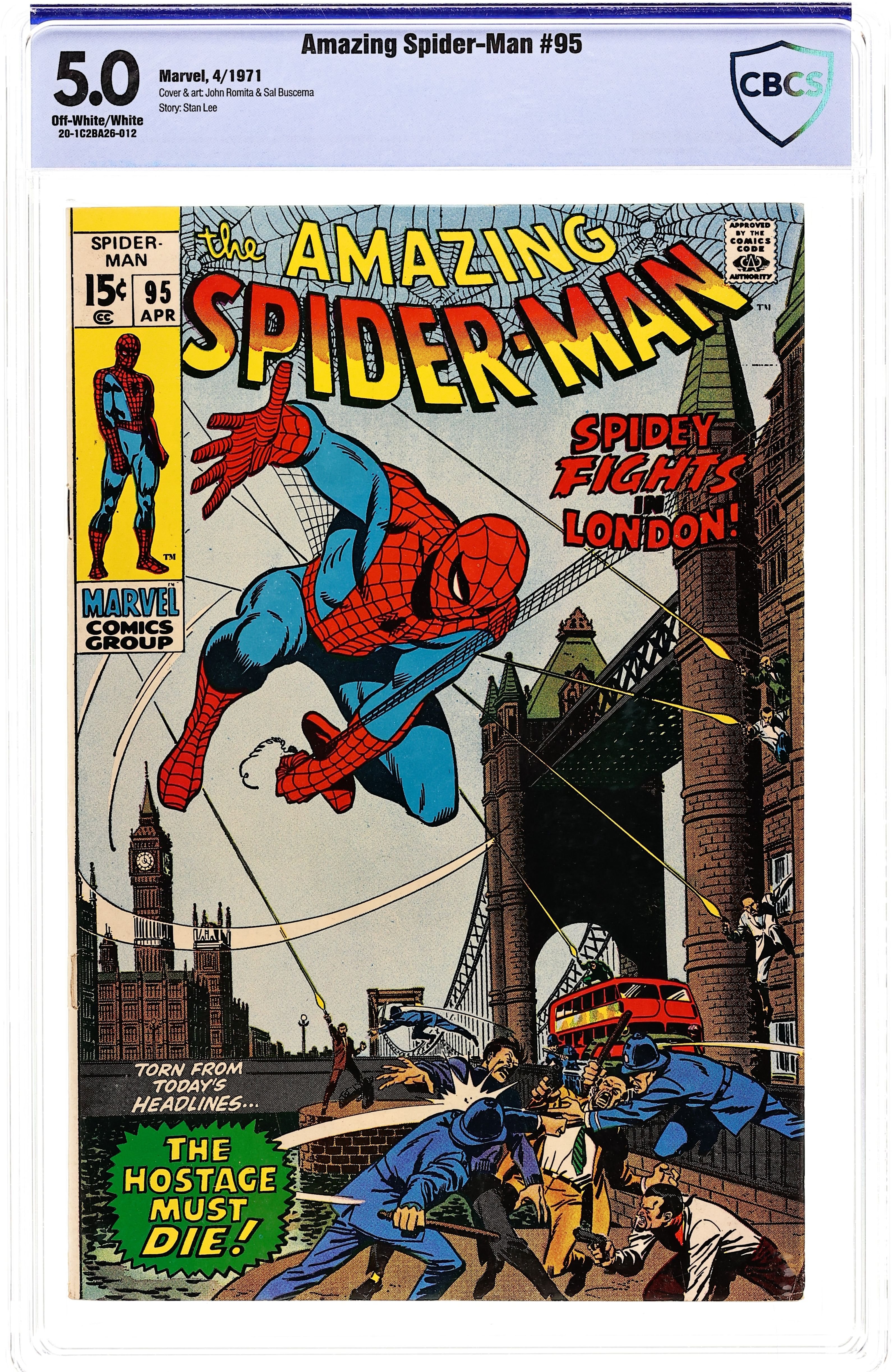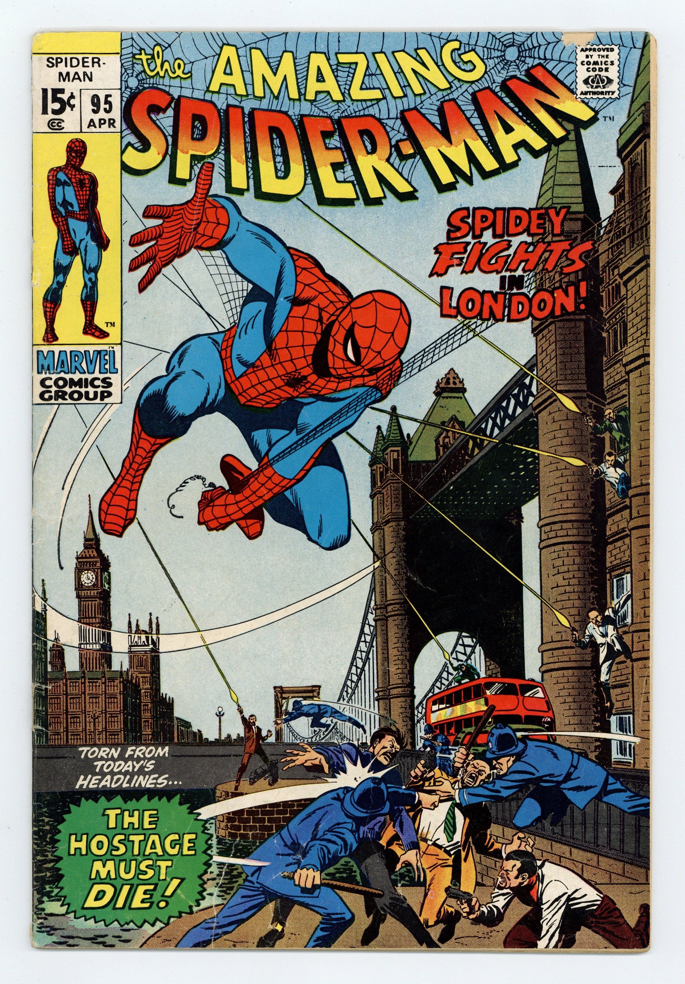 "Trap for a Terrorist!" Script by Stan Lee. Pencils by John Romita. Inks by Sal Buscema. Cover by John Romita and Sal Buscema. As a favor to the Daily Bugle's freelance photographer, Joe Robertson sends Peter Parker to England for a special assignment (and also to visit Gwen Stacy.) Aunt May's nephew is overjoyed about his business trip and quickly hops on an airplane bound for London. However also on the flight is a high-ranking American diplomat -- who is abducted by terrorists once the place lands at Heathrow Airport! Fortunately, Peter brought his familiar red and blue suit across the pond! And the Amazing Spider-Man swings into action from the Tower Bridge to the Big Ben Clock -- to save the American delegate! But will the web-slinger's much-publicized appearance in London derail Peter's plan to visit Gwen? Cameo appearances by J. Jonah Jameson, Aunt May, Anna Watson, Mary Jane Watson, Harry Osborn, Arthur Stacy, and Nancy Stacy. (Notes: This story was reprinted in Marvel Tales #76. The letters page includes a statement of ownership: average print run 596,102; average paid circulation 322,195.) 36 pages. Cover price $0.15.