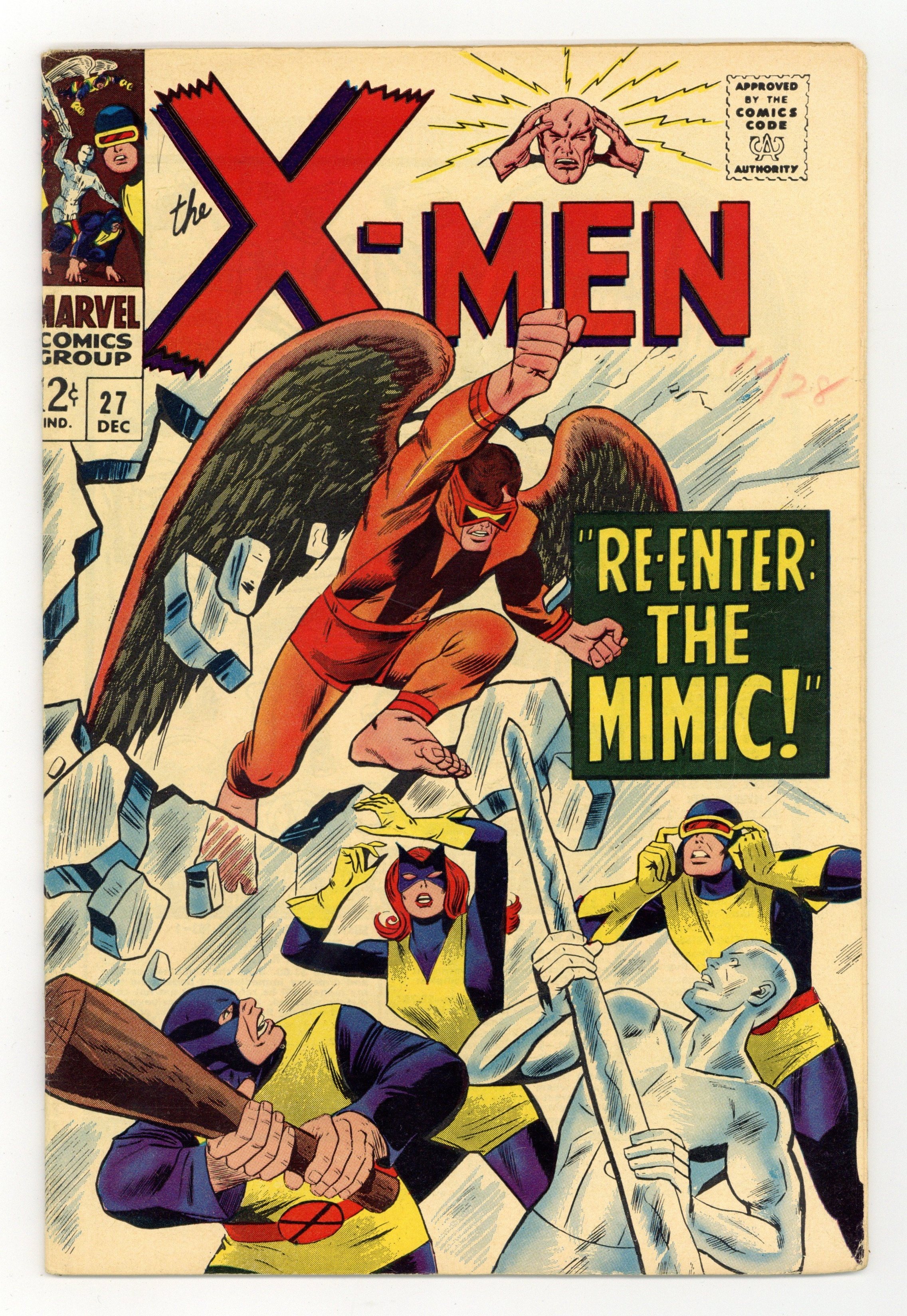 Cover pencils by Werner Roth, inks by Dick Ayers. Re-Enter: The Mimic!, script by Roy Thomas, pencils by Werner Roth, inks by Dick Ayers; Angel rests in the wake of getting hit with Cyclops' optic blast; Mimic recovers his powers and memoriesl X-Men battle the Puppet Master; Cameos by Spider-Man and the Fantastic Four.. 36 pgs. $0.12. Cover price $0.12.