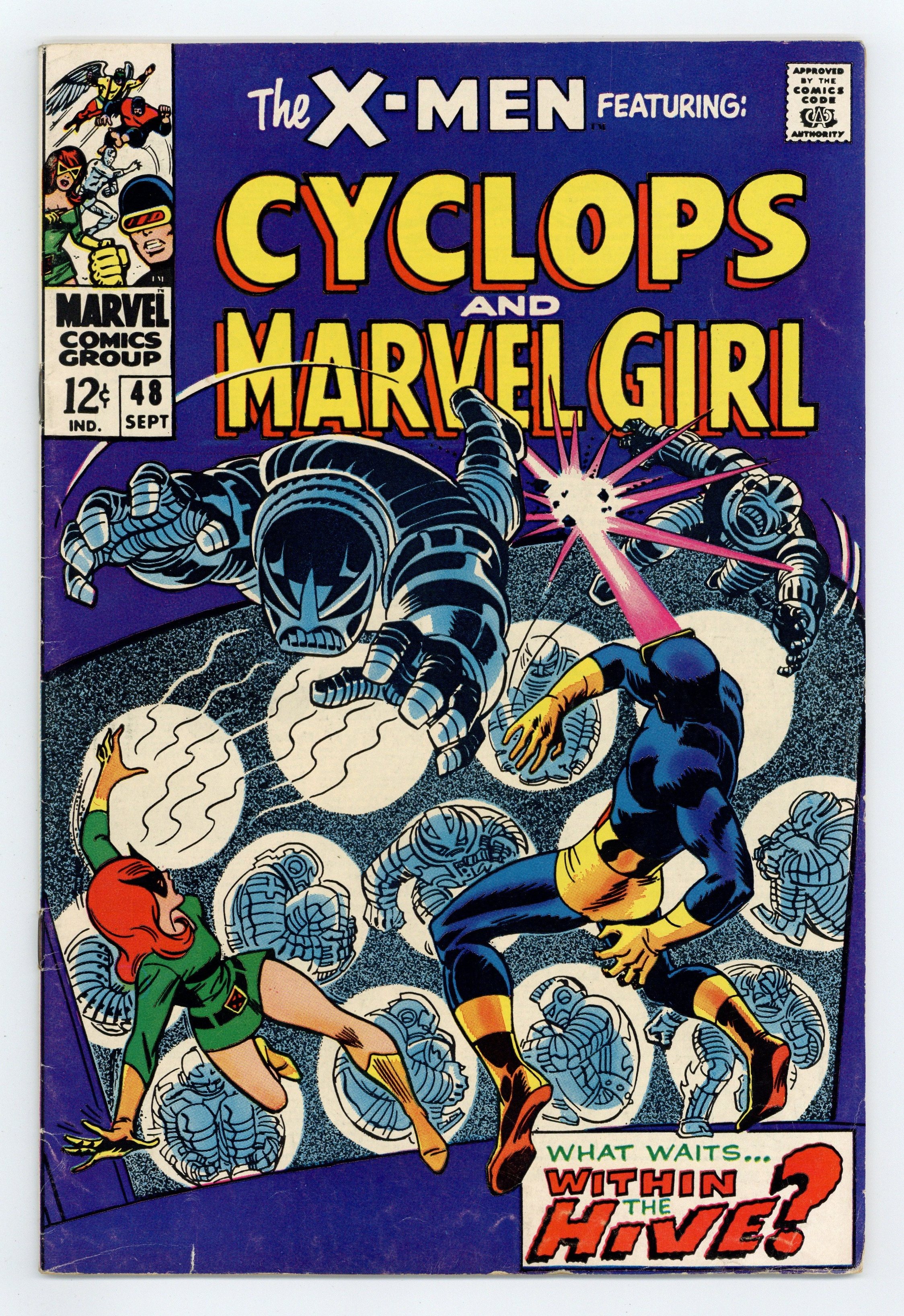Cover pencils by John Romita, inks by Frank Giacoia. Beware Computo Commander of the Robot Hive!, script by Arnold Drake, pencils by Don Heck and Werner Roth, inks by John Verpoorten; Iceman and Beast go to California while Cyclops and Jean battle robots in New York; a giant robot named Computo makes small robot warriors; Quasimodo appears. Yours Truly the Beast, script by Arnold Drake, pencils by Werner Roth, inks by John Verpoorten; Beasts abilities explained. Letter to the editor from comic writer Tony Isabella. 36 pgs. $0.12. Cover price $0.12.