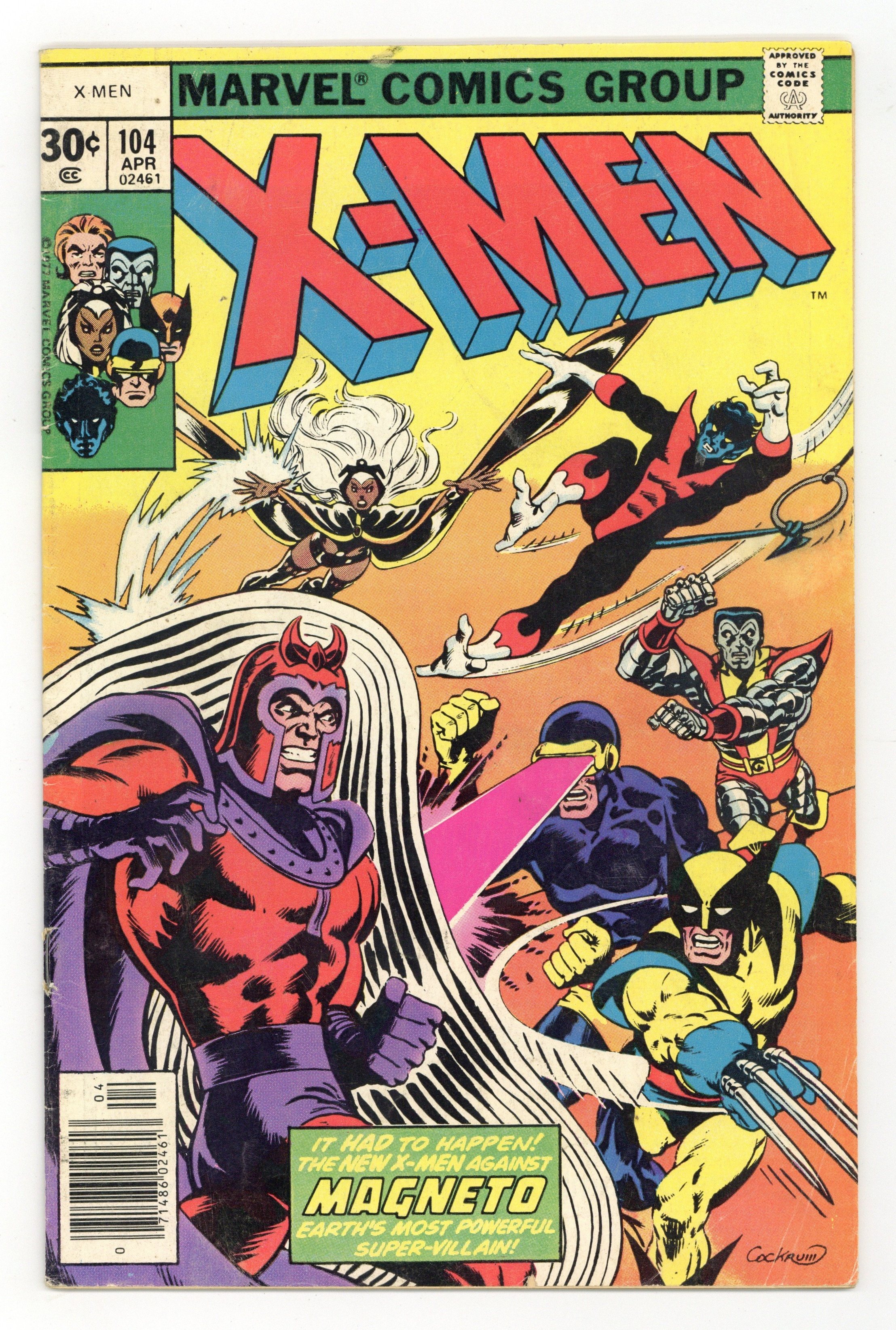 Starts Feb 9 "Magneto!" Starjammers cameo. Story by Chris Claremont. Art by Dave Cockrum and Sam Grainger. You knew it had to happen sooner or later, the all new X-Men must battle the team's oldest and most dangerous adversary - Magneto, the Master of Magnetism! Plus, who are the Starjammers, and what is Mutant X? NOTE: 1st appearance of the Starjammers - Corsair and Ch'od. 36 pgs. Cover price $0.30.