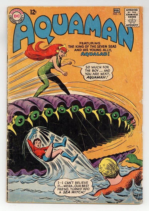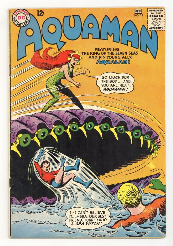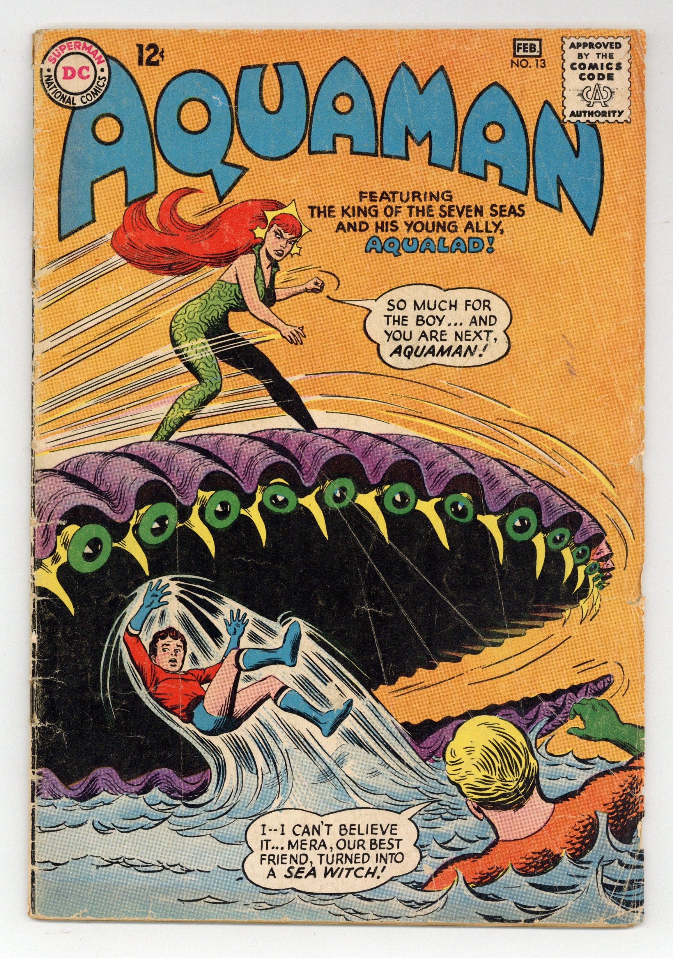 Cover art by Nick Cardy. Invasion of the Giant Reptiles starring Aquaman, Aqualad, Mera, Nicoll, and Futuremen from the year 2098, script by Jack Miller, art by Nick Cardy; prehistoric creatures emerge from an opening created by an underwater earthquake. Doctor Rocket humor half-page by Henry Boltinoff. Underwater Treasure article. 32 pgs. $0.12. Cover price $0.12.