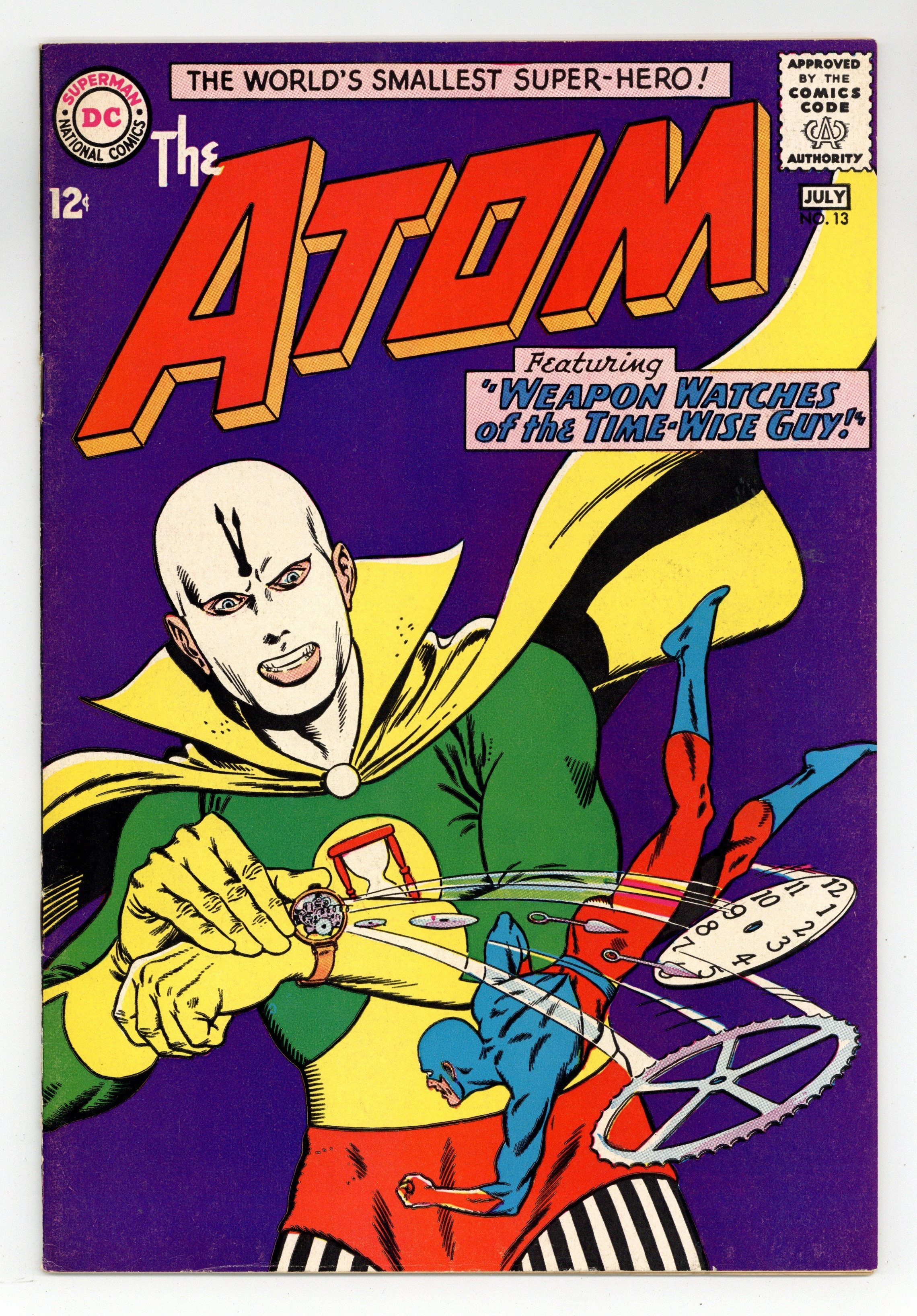 Cover pencils by Gil Kane, inks by Murphy Anderson. "Weapon Watches of the Time-Wise Guy!", script by Gardner Fox, pencils by Gil Kane, inks by Sid Greene; Chronos escapes from prison and plans to steal a number of clocks made by the artist Anton Teljas which have priceless jewels inside. Ad for Superboy Annual. Ad for the "New Look" in Batman and Detective Comics. "I Accuse Ray Palmer-Of Robbery!", script by Gardner Fox, pencils by Gil Kane, inks by Murphy Anderson; Ray Palmer is present at the robbery of several rare coins, and later he is accused of being an accomplice of the thieves, so the Atom must clear his own name. Letter to the editor from mycomicshop.com owner Buddy Saunders. 36 pgs., full color. $0.12. Cover price $0.12.