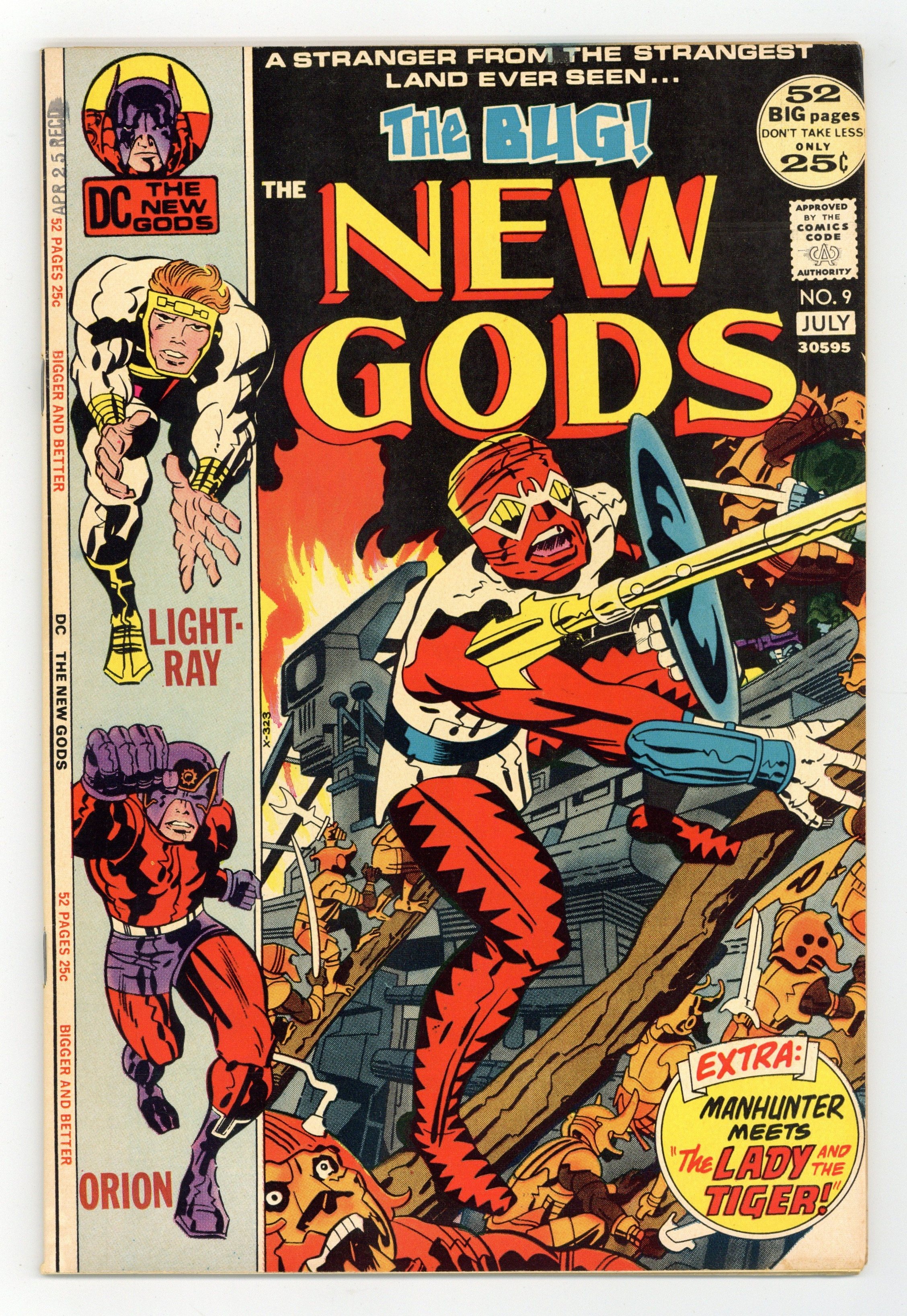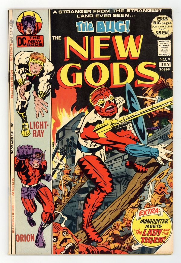Starts Apr 20 Cover pencils by Jack Kirby, inks by Mike Royer. The Bug!, script and pencils by Jack Kirby, inks by Mike Royer; Forager is given the task of searching out Orion and help him stop Mantis from mobilizing all the bugs into a large army. The Lady and the Tiger, script and art by Joe Simon and Jack Kirby. Letter from comics writer Bob Rozakis. 52 pgs. $0.25. Cover price $0.25.