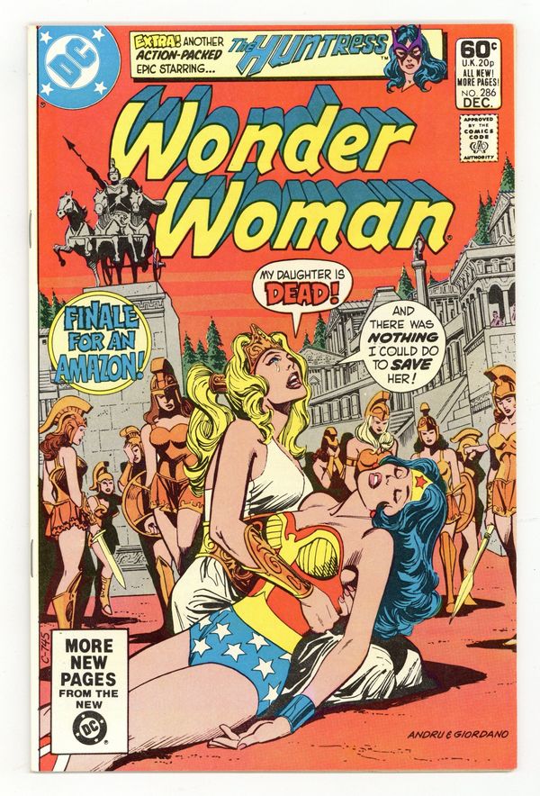 Tags: Wonder Woman$9.00Cover pencils by Ross Andru, inks by Dick Giordano. "Be Wonder Woman... and Die!", script by Robert Kanigher, pencils by Jose Delbo, inks by Dave Hunt; Wonder Woman gives a wannabe actress who wishes to play her in a movie the chance to play her in real life, not knowing that the girl has only six months to live and that she will die accepted by the Amazons as one of their own. "Karnage is the Name," script by Paul Levitz, pencils by Joe Staton, inks by Bruce Patterson; Huntress vs. Karnage; Batman flashback. The Penguin stars in a one-page Hostess ad, "Penguins on Parade." 36 pages, Full Color. Cover price $0.60.