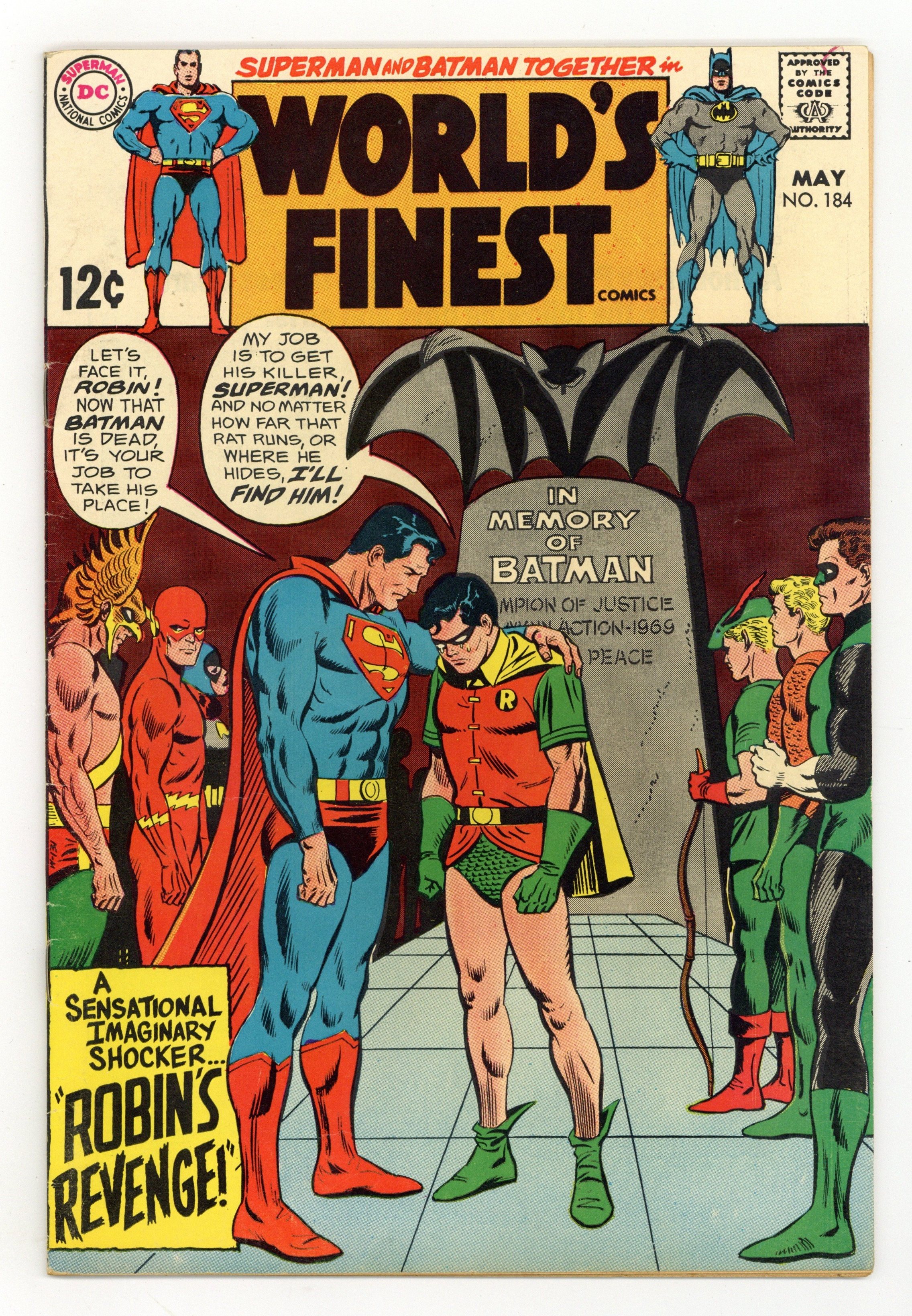 Cover pencils by Curt Swan, inks by Mike Esposito. Robin's Revenge! starring Superman and Batman, script by Cary Bates, pencils by Curt Swan, inks by Jack Abel; After the Automator kills the Batman, Robin devotes the next ten years of his life to hunting down the killer. When the thief dubbed Golden Gloves starts operating using technology strikingly similar to the Automator's, Superman and Robin investigate and discover that Golden Gloves isn't the Automator, but a brainwashed Batman, who was actually teleported away ten years ago by the Automator, whom they finally bring to justice. Description of the first Batman story in Detective Comics #27. John Jones' Farewell to Earth starring the Martian Manhunter, art by Joe Certa; J'onn J'onzz meets a team of security officers from Jupiter who are seeking S'Vor, an escaped criminal on Earth. 36 Pages, Full Color. Cover price $0.12.