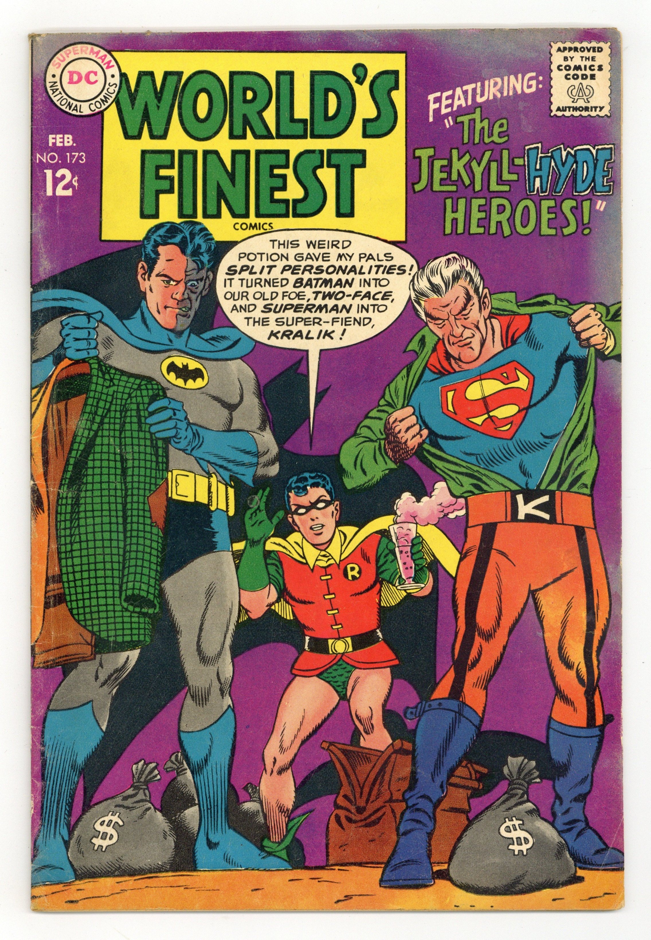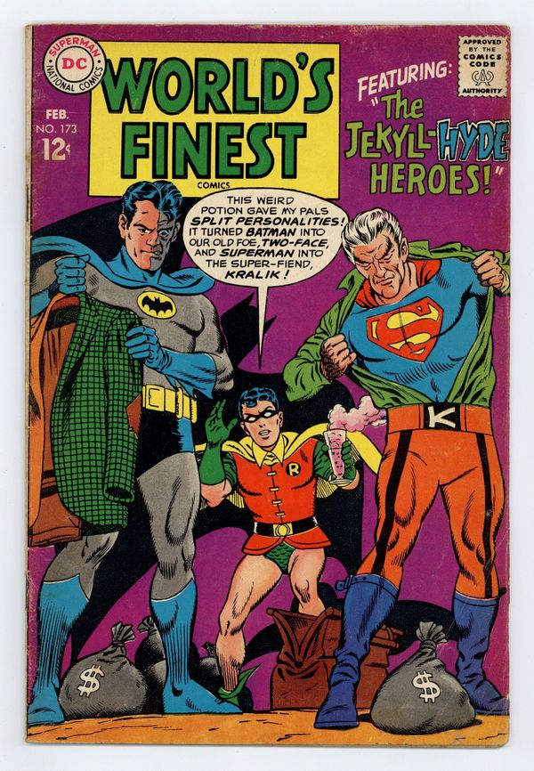 1st Silver Age appearance of Two-Face. Cover pencils by Curt Swan, inks by George Klein. The Jekyll-Hyde Heroes starring Superman and Batman, script by Jim Shooter, pencils by Curt Swan, inks by George Klein; Dr. Arron's Psyche-Distortor chemicals cause complete character reversal in Superman and Batman, turning them into their own worst enemies. The Super-Key to Fort Superman--Editors' Round Table: Superman, script by Jerry Coleman, pencils by Wayne Boring, inks by Stan Kaye; Someone has broken into Superman's Fortress of Solitude, so Superman searches the place for clues. Half-page ad with Neal Adams's pencils for the cover of Lois Lane 81. 36 Pages, Full Color. Cover price $0.12.