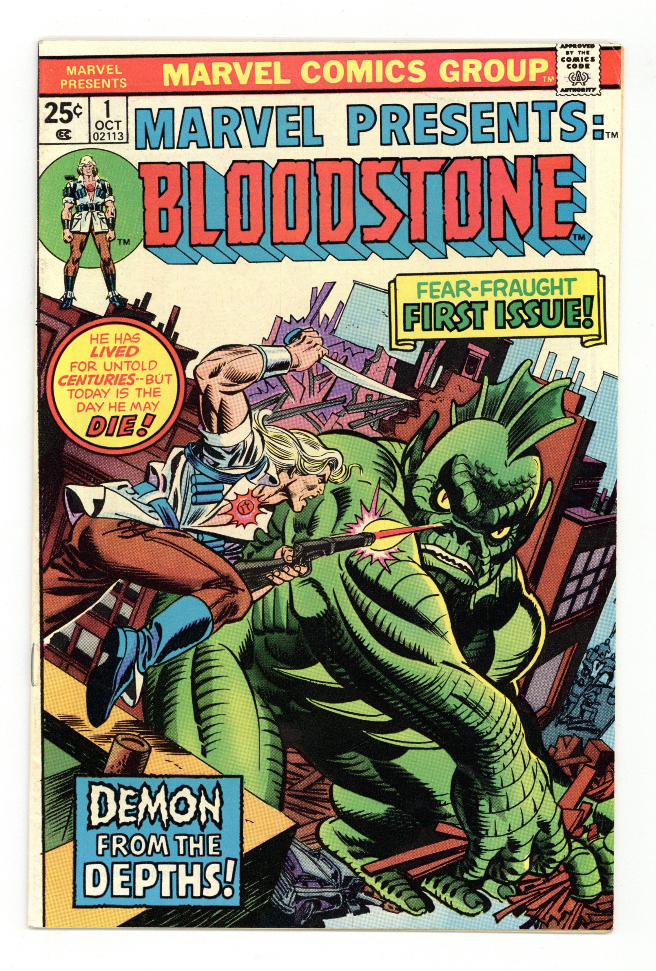 $14.00Cover pencils by Gil Kane, inks by Frank Giacoia. Origin and 1st appearance of Bloodstone in "Dweller From the Depths!," script by John Warner, pencils by Mike Vosburg, inks by Bob McLeod; Ulysses Bloodstone battles a creature the Possessor calls from the sea. "Part Two: The Lurker Within," script by John Warner, art by Pat Boyette; Bloodstone fights the Possessor and during the battle the Possessor attempts to possess Bloodstone and is able to reach into Bloodstone's mind and see his life before he obtained the bloodstone. Marvel Comic Con 1975 ad. Marvel Bullpen Bulletins: The King Is Back!; 'Nuff Said!; Stan Lee's Soapbox. 36 pgs., full color. $0.25. Cover price $0.25.