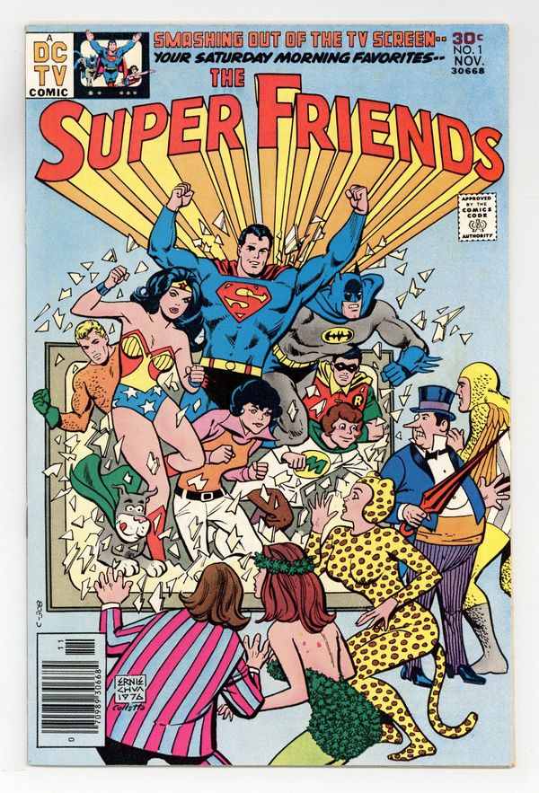 "The Fury of the Super Foes." Aquaman, Batman, Robin, Superman and Wonder Woman attempt to prevent Penguin, Poison Ivy, Cheetah, and others from stealing the components of a super robot. The Super Friends, which are essentially a watered down version of the Justice League, appeared in the Saturday morning animated series of the same name. Script by E. Nelson Bridwell, pencils by Ric Estrada and Joe Orlando, inks by Vince Colletta. Cover by Ernie Chua. Cover price $0.30.