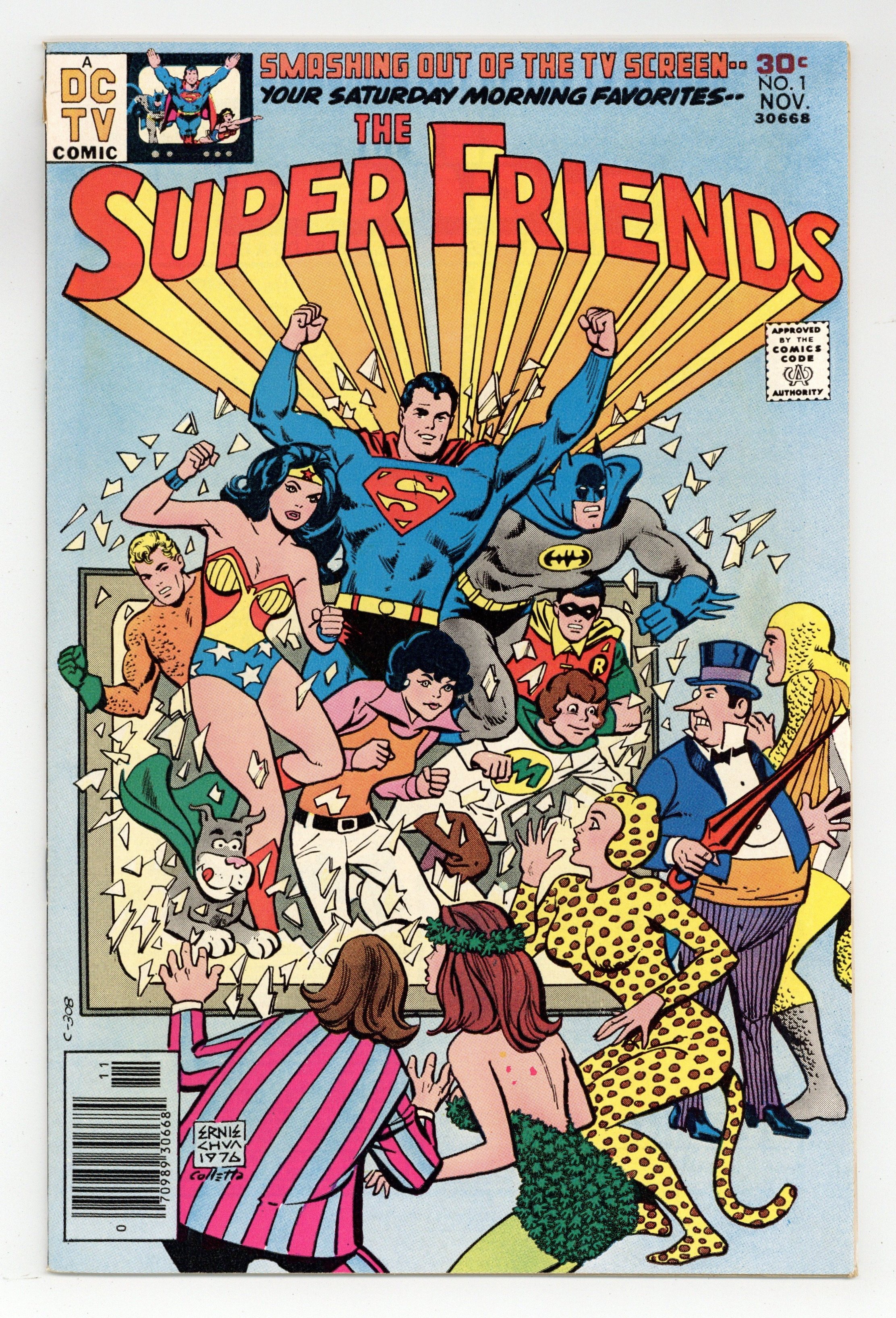 $21.50"The Fury of the Super Foes." Aquaman, Batman, Robin, Superman and Wonder Woman attempt to prevent Penguin, Poison Ivy, Cheetah, and others from stealing the components of a super robot. The Super Friends, which are essentially a watered down version of the Justice League, appeared in the Saturday morning animated series of the same name. Script by E. Nelson Bridwell, pencils by Ric Estrada and Joe Orlando, inks by Vince Colletta. Cover by Ernie Chua. Cover price $0.30.