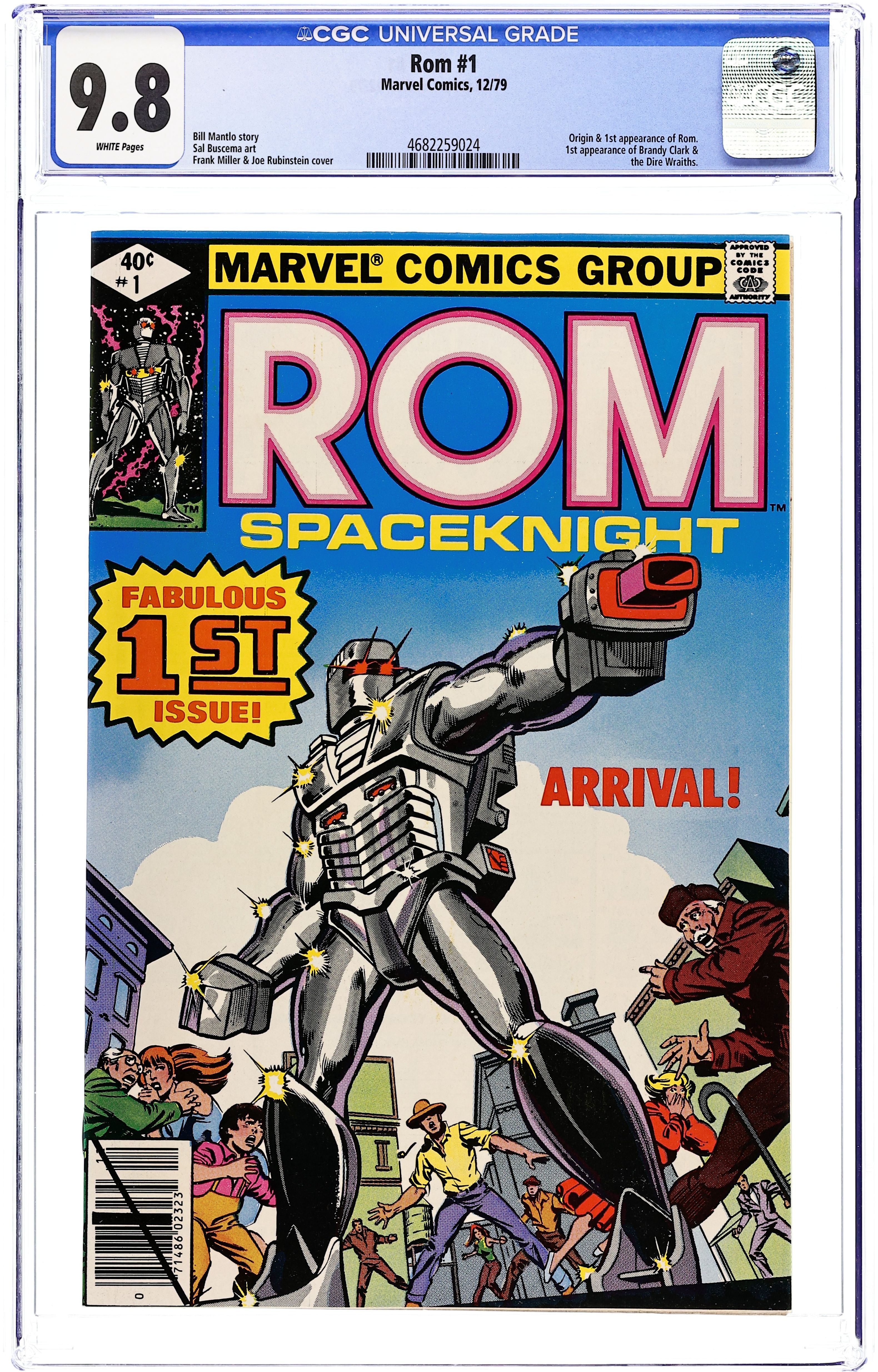 Tags: ROM Spaceknight$29.00Direct Edition. Story by Bill Mantlo. Art by Sal Buscema. Frank Miller cover. Deep in space two centuries ago a decisive battle between the forces of good and evil was fought. The brave Spaceknights of Galador defeated the evil sorcery and super-science of the Dire Wraiths and scattered them to the furthest reaches of the galaxy. Now in present day their eternal struggle has spilled over to Earth. Rom, greatest of the Spaceknights, has arrived in Clairton, a small West Virginia town. Frightened by the arrival of a 7' alien, the people of Clairton have called in the National Guard. Can Rom convince those he came to save that the true enemy resides in their very ranks? 32 pages. Cover price $0.40.