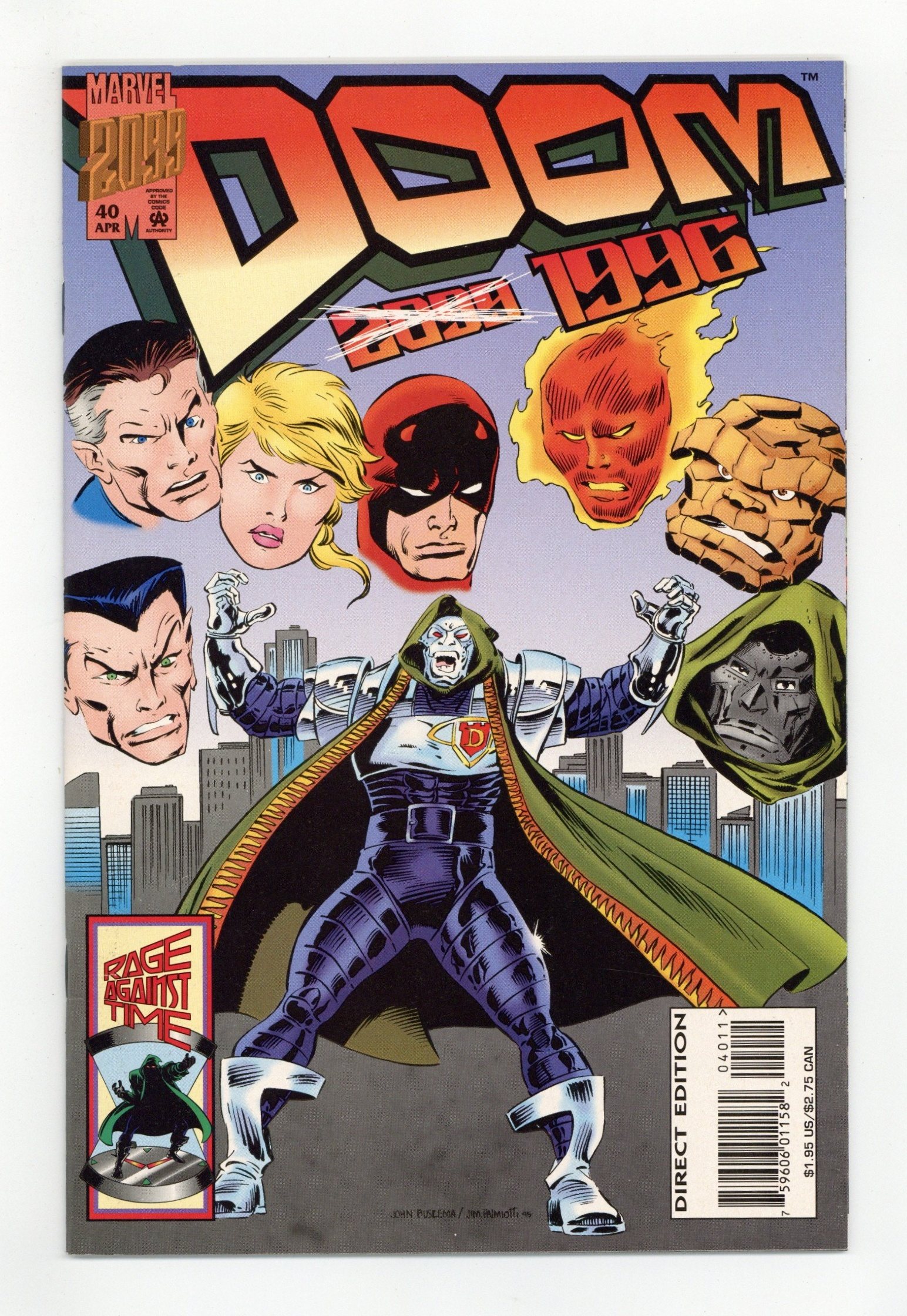 Rage Against Time: Part 1 of 4: Visitation - Written by Tom Peyer. Art by John Buscema & Scott Koblish. Cover by John Buscema & Jimmy Palmiotti. Doom travels to the modern day Marvel Universe! Doom's plan to save Latveria leads him to 1996 -- face first with a ton of Marvel characters -- and smack into the Fantastic Four headquarters! Daredevil, Doctor Doom, Doctor Strange, Sub-Mariner appearances. 32 pages, full color. Cover price $1.95.