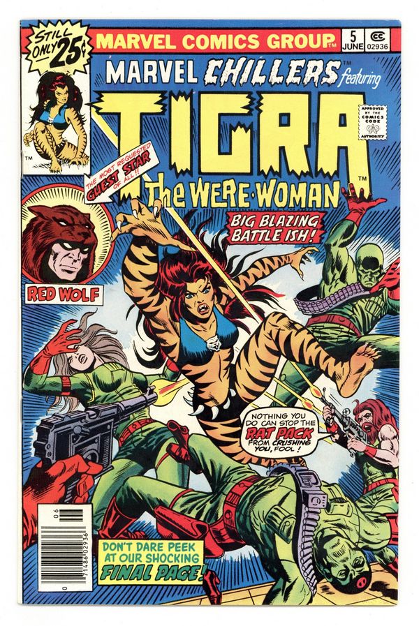 $19.5025 cent edition. Cat and Mouse - Written by Tony Isabella. Art by Will Meugniot and Vince Colletta. Cover inks by Frank Giacoia. Big blazing battle issue! Featuring the most requested guest star of all -- Red Wolf! Can Tigra do anything to stop Joshua Plague and the Rat Pack from crushing her? Don't dare peek at the shocking final page! 32 pages, full color. Cover price $0.25.