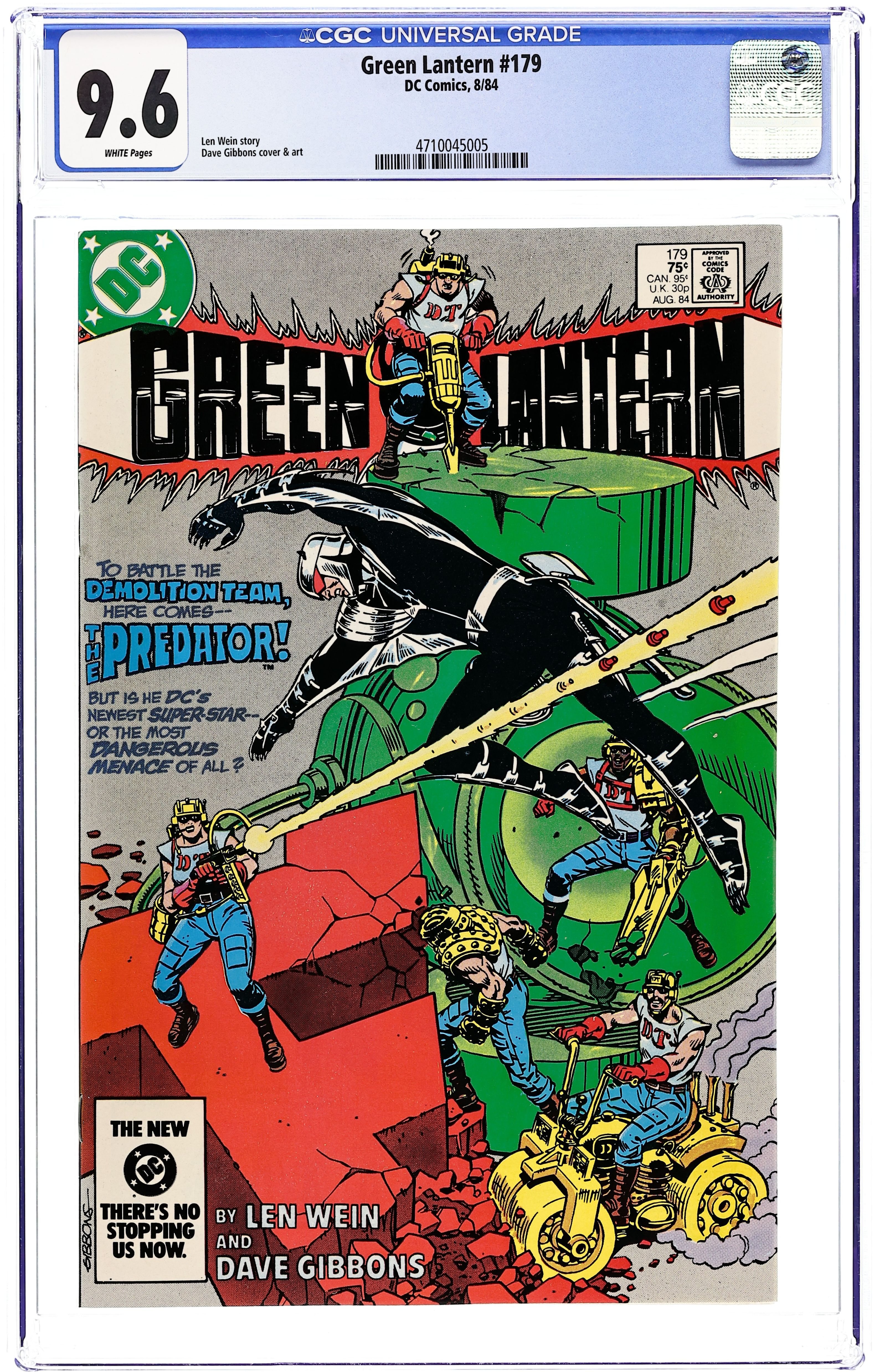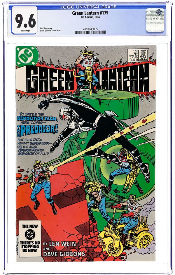 "Let Us Prey." While Green Lantern attempts to save a planet in space, the Predator battles the Demolition Crew. Script by Len Wein, art by Dave Gibbons. "Enemy Lines" part one. Hollika Rahn stars in this Tales of the Green Lantern Corps backup story. Script by Todd Klein, art by Gibbons. Cover by Gibbons. Cover price $0.75.