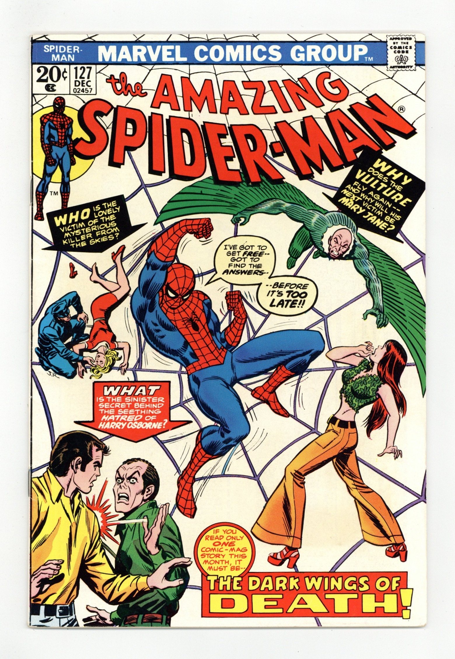 $43.50Mark Jeweler Advertisement Insert Variant. First appearance of the third Vulture (Dr. Clifton Shallot) in "The Dark Wings of Death." Script by Gerry Conway, pencils by Ross Andru, inks by Frank Giacoia and Dave Hunt. John Romita Sr. cover. Human Torch (of the Fantastic Four) guest appearance. Cover price $0.20.