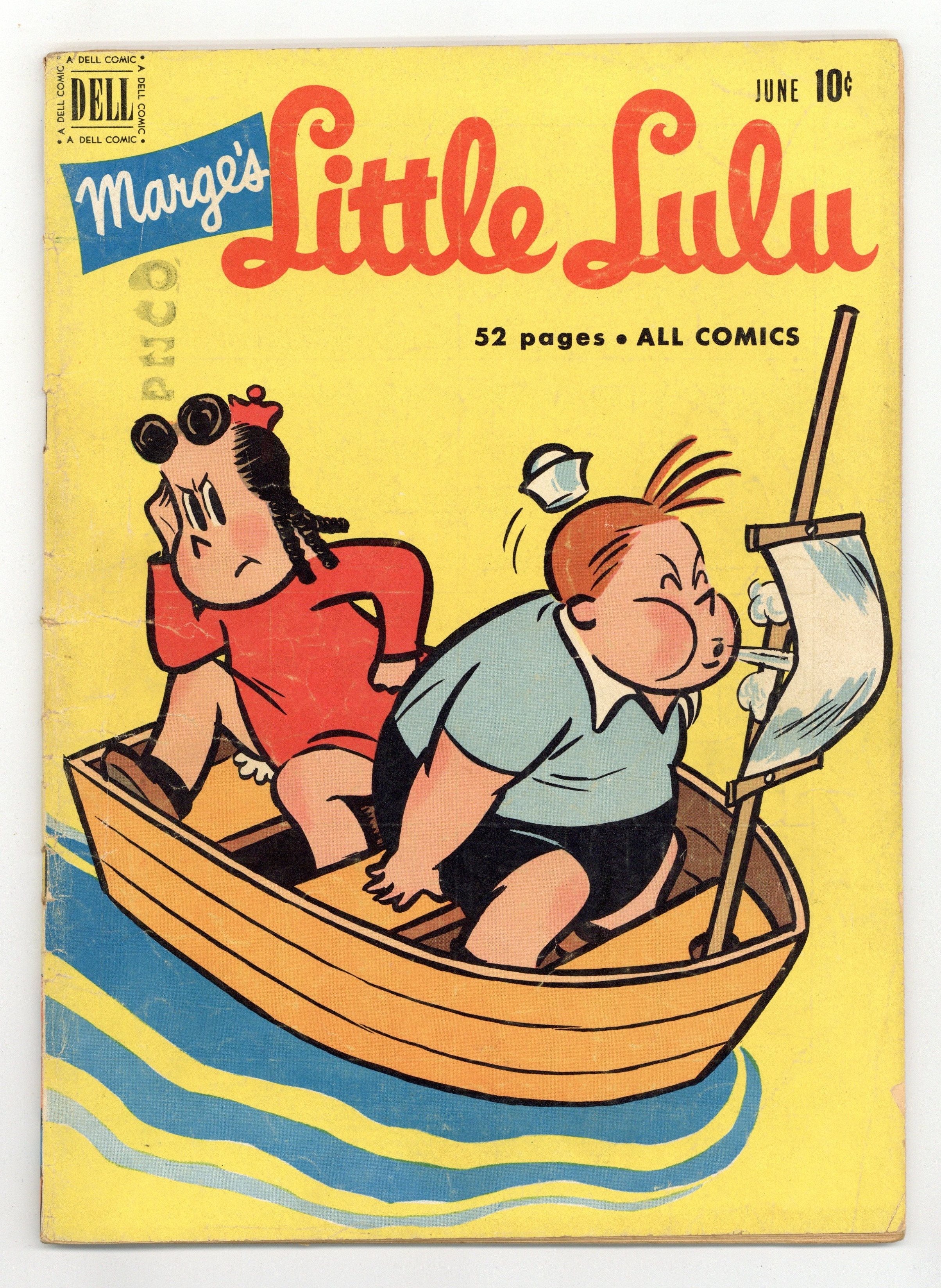 Published Jun 1951 by Dell/Gold Key.$23.00Cover art by Irving Tripp. Pieces of Eight; Lulu, Tubby, and Alvin dig up a trunk full of treasure at the beach. Untitled Little Lulu story; The Fellers think their clubhouse is going to be torn down, so they sell it to Lulu. Thirsty Children; Lulu tells Alvin about when she lost her mother and goes looking all over the world for her. Tub's Big Moment; Tubby is devastated when he cant afford to attend Little Rita Rosebud's stage show. All scripts by John Stanley, art by Irving Tripp. Two-page text story, Lulus Diry ("Diary"). Back cover has advertisement for five color Little Lulu pinups and Dell Comics Club. 52 pages, full color. Cover price $0.10.