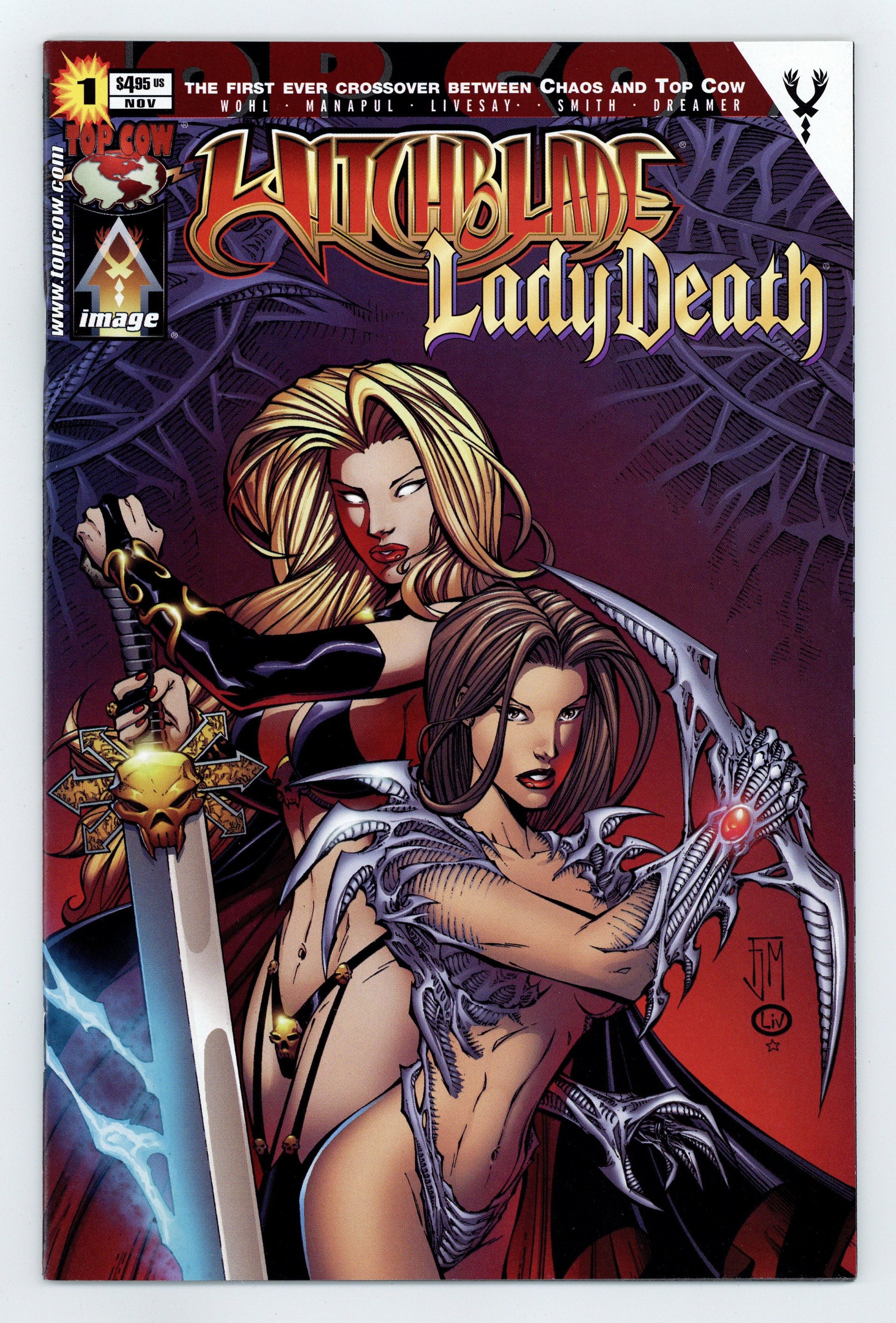 Published Nov 2001 by Top Cow/Chaos.$14.25Top Cow Comics (W) David Wohl, (P) Francis Manapul, (I) Livesay, (C) Jonathan D. Smith Worlds collide in Top Cow's first ever cross-over with Chaos Comics as Lady Death invades the Top Cow Universe in search of Sara Pezzini and the Witchblade!!! Join Witchblade co-creator and co-scribe David Wohl and Top Cow's newest penciling sensation Francis Manapul as they venture from the darkest depths of hell to the streets of New York City in a tale of two women and their tormented souls. The crossover event of the year is here! FC, 48pg $4.95 Cover price $4.95.