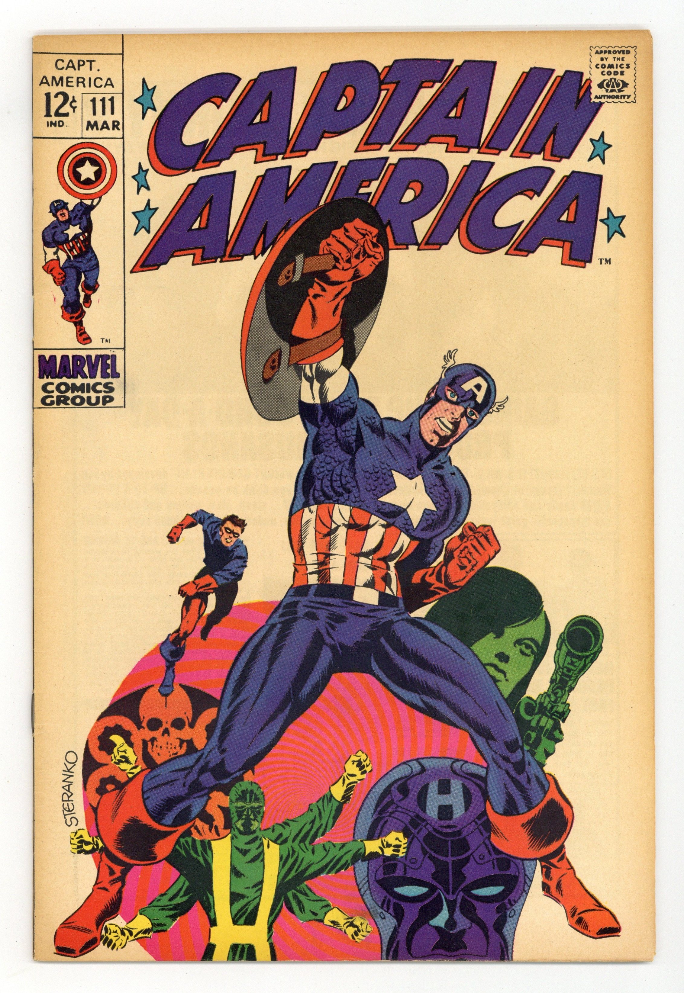 Cover by Jim Steranko. "Tomorrow You Live, Tonight I Die!", script by Jim Steranko (plot) and Stan Lee (dialogue), pencils by Jim Steranko, inks by Joe Sinnott; Cap is ambushed by HYDRA assassins at the command of Madame Hydra; The mission fails and later Rick Jones joins Cap in a training session; Alone, Rick picks up a message meant for Cap that causes him to hallucinate; Abducted by Hydra Cap searches for Rick and is attacked by a Hydra robot; Rick escapes & tries to warn Cap, who realizes he could make a good partner; Cap appears to leap from a rooftop into the river through a barrage of HYDRA gunfire; The police only find his costume and a mask with the facial features of Steve Rogers, suggesting "Rogers" was a fake identity; Bucky Barnes cameo. 36 pgs., full color. $0.12. Cover price $0.12.