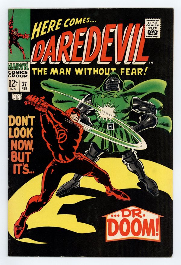Tags: Marvel Legacy Numbering: Daredevil (part 37), Daredevil$90.00Cover pencils by Gene Colan, inks by Frank Giacoia. Don't Look Now, But It's Dr. Doom, script by Stan Lee, pencils by Gene Colan, inks by John Tartaglione; Doom captures Daredevil and switches bodies with our hero; cameo flashback featuring Mr. Fantastic, Invisible Girl, Human Torch, and Galactus. 36 pgs. Cover price $0.12. Cover price $0.12.